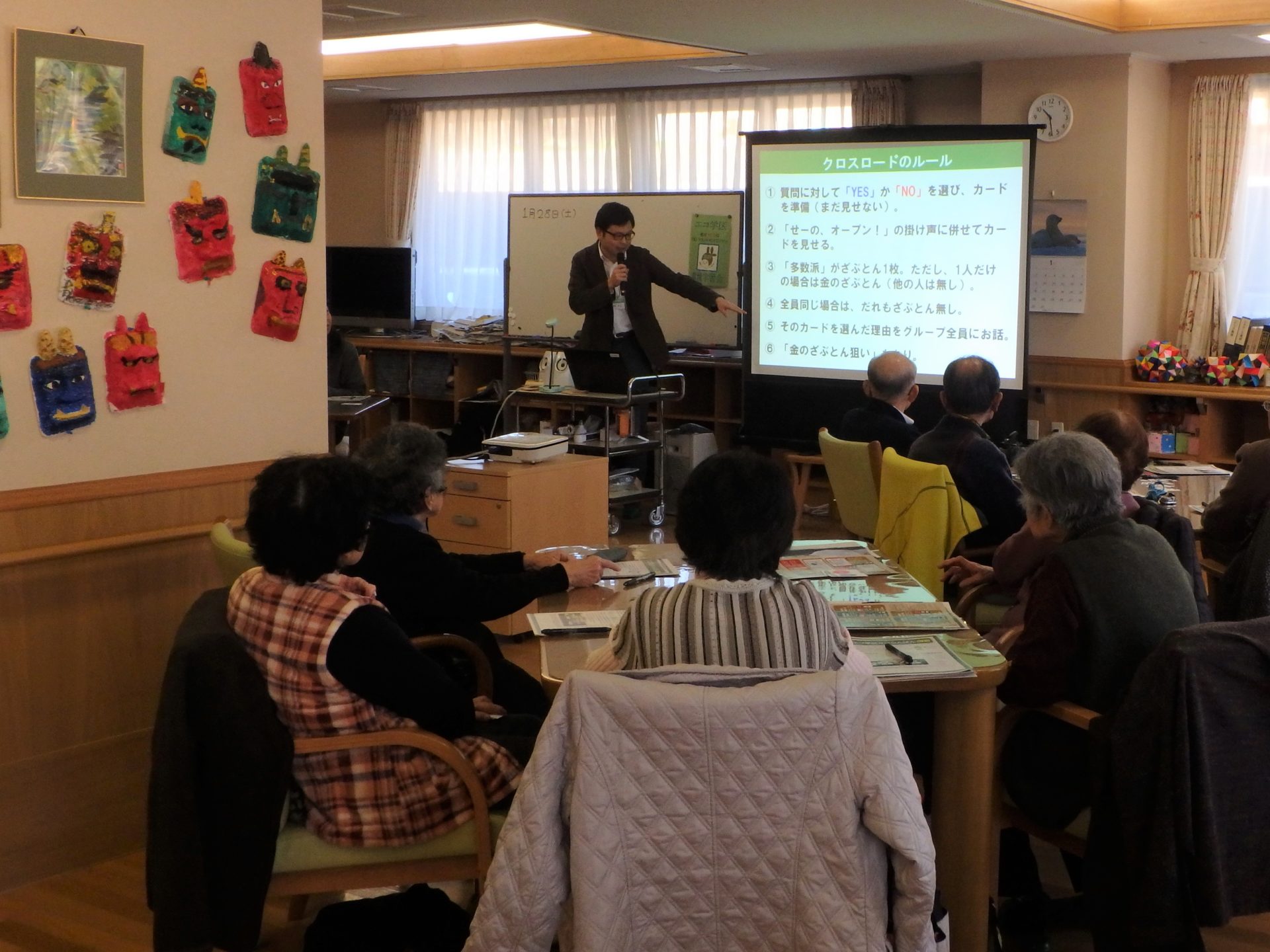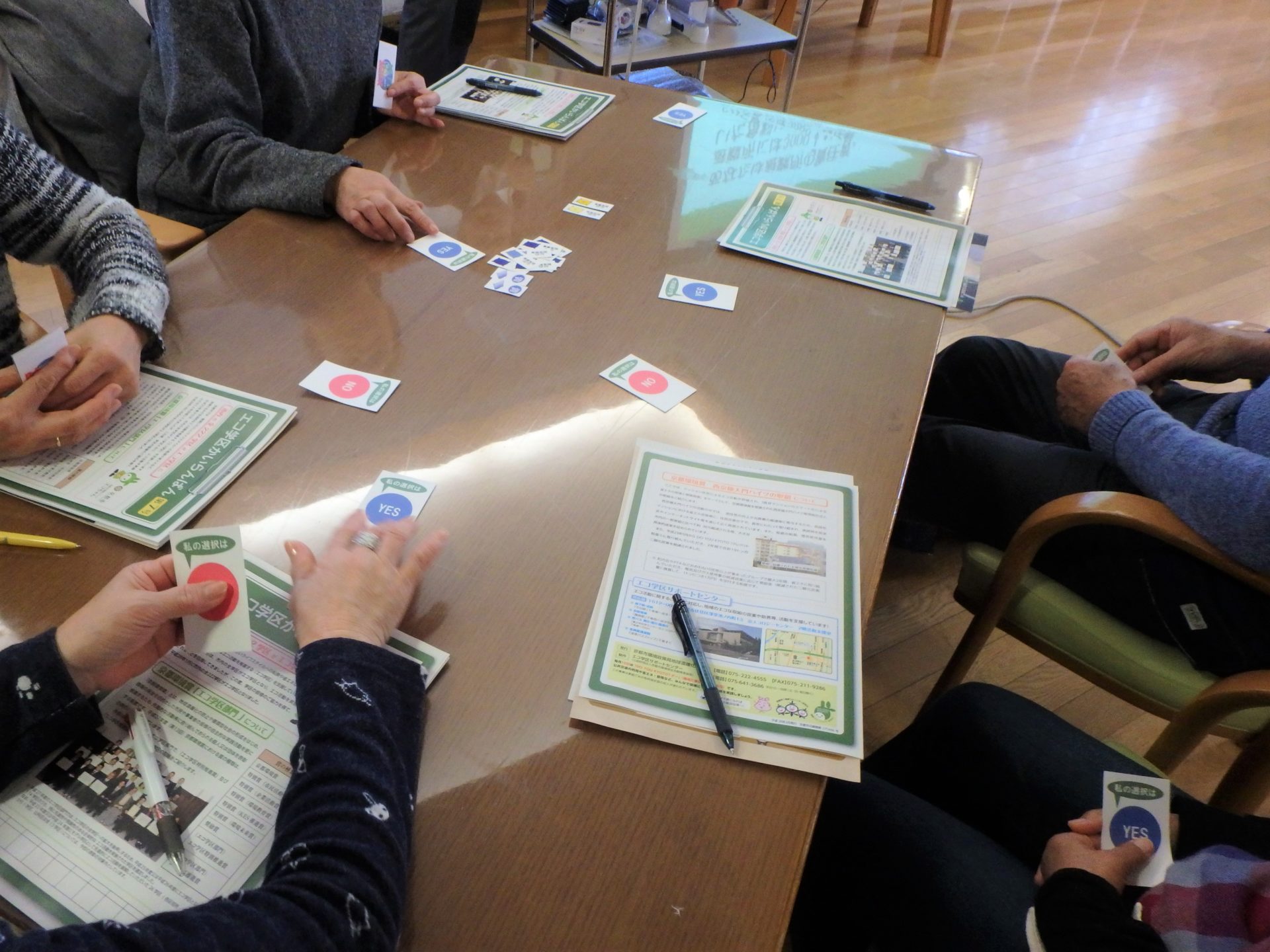 | 様子 | 一回目の学習会に参加できなかった方を対象に,温暖化の解説やクロスロードゲームを実施し,チームで意見交換を行いました。防災エコグッズの展示・説明も行ったところ,参加者の関心を集めたくさん質問がありました。 |