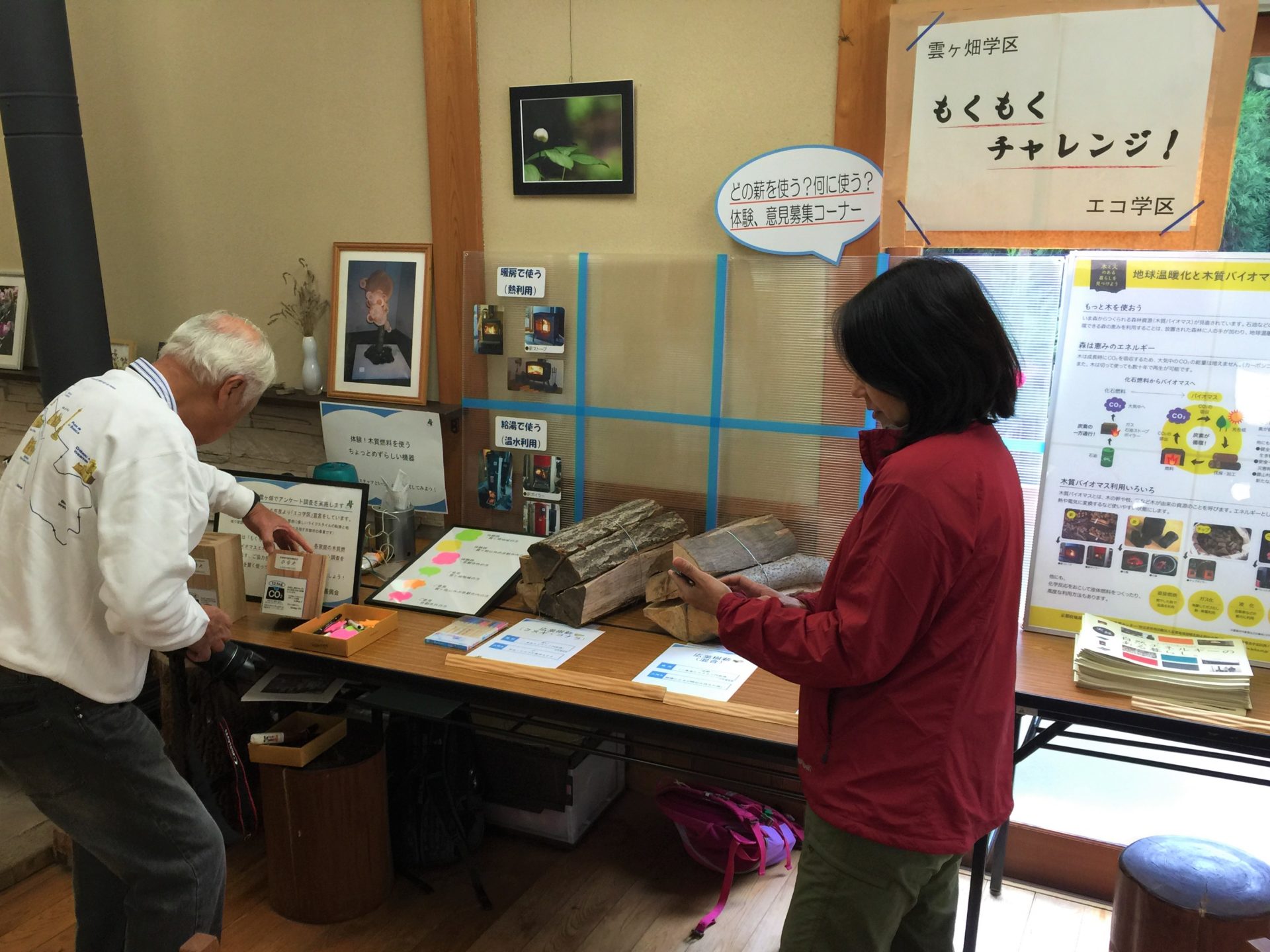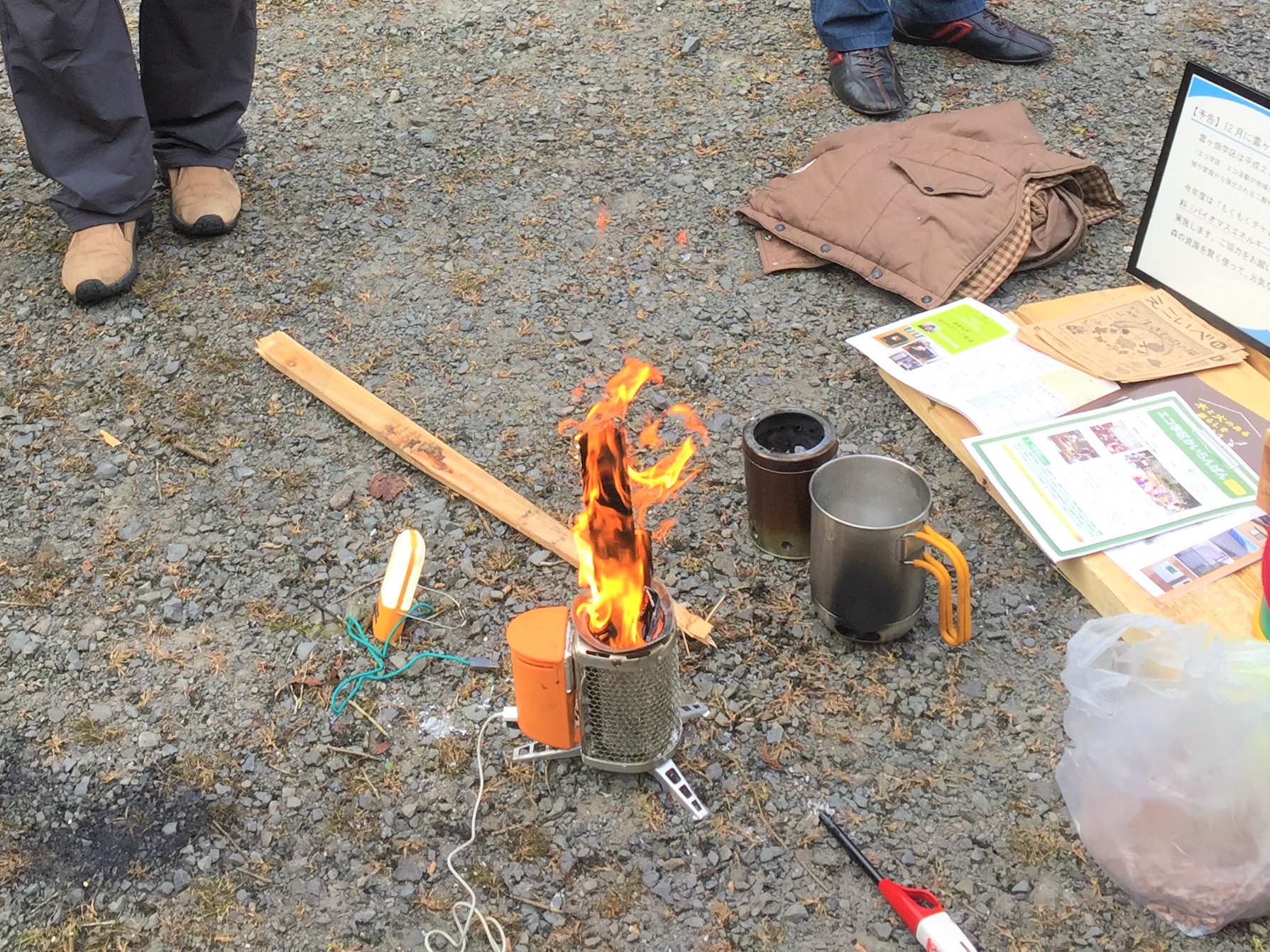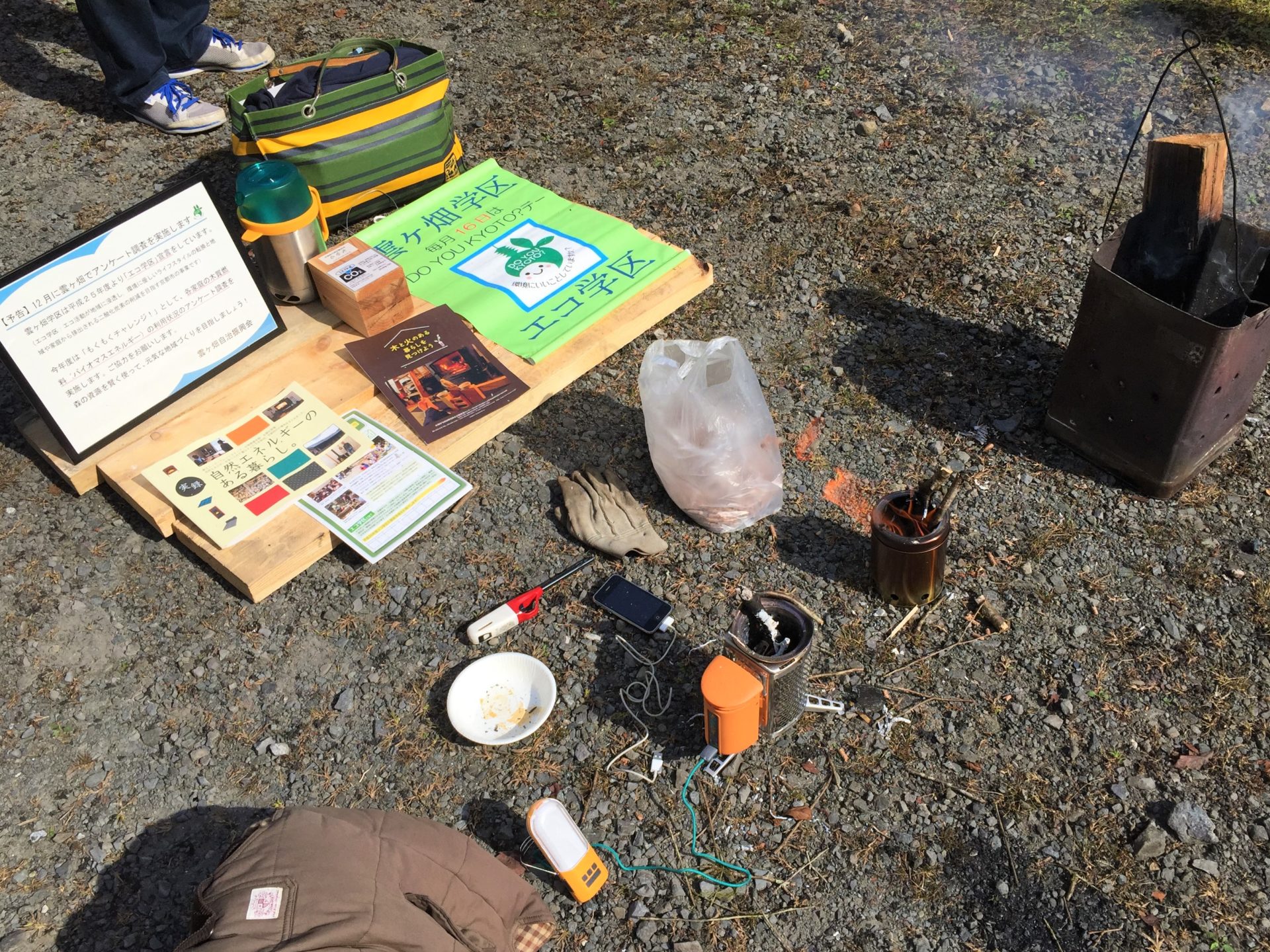 様子 地球温暖化についての現状と,対策の一つとして最新の木質バイオマスエネルギー機器の展示と木質バイオマス利用の意義についてのアピールを行いました。合わせて本プログラムで実施した全戸アンケートについても事前告知を行いました。薪を効率的に燃やしながら発電を行えるBioLite の実演展示や種類の違う薪の実物展示には皆さんの関心が集まりました。
