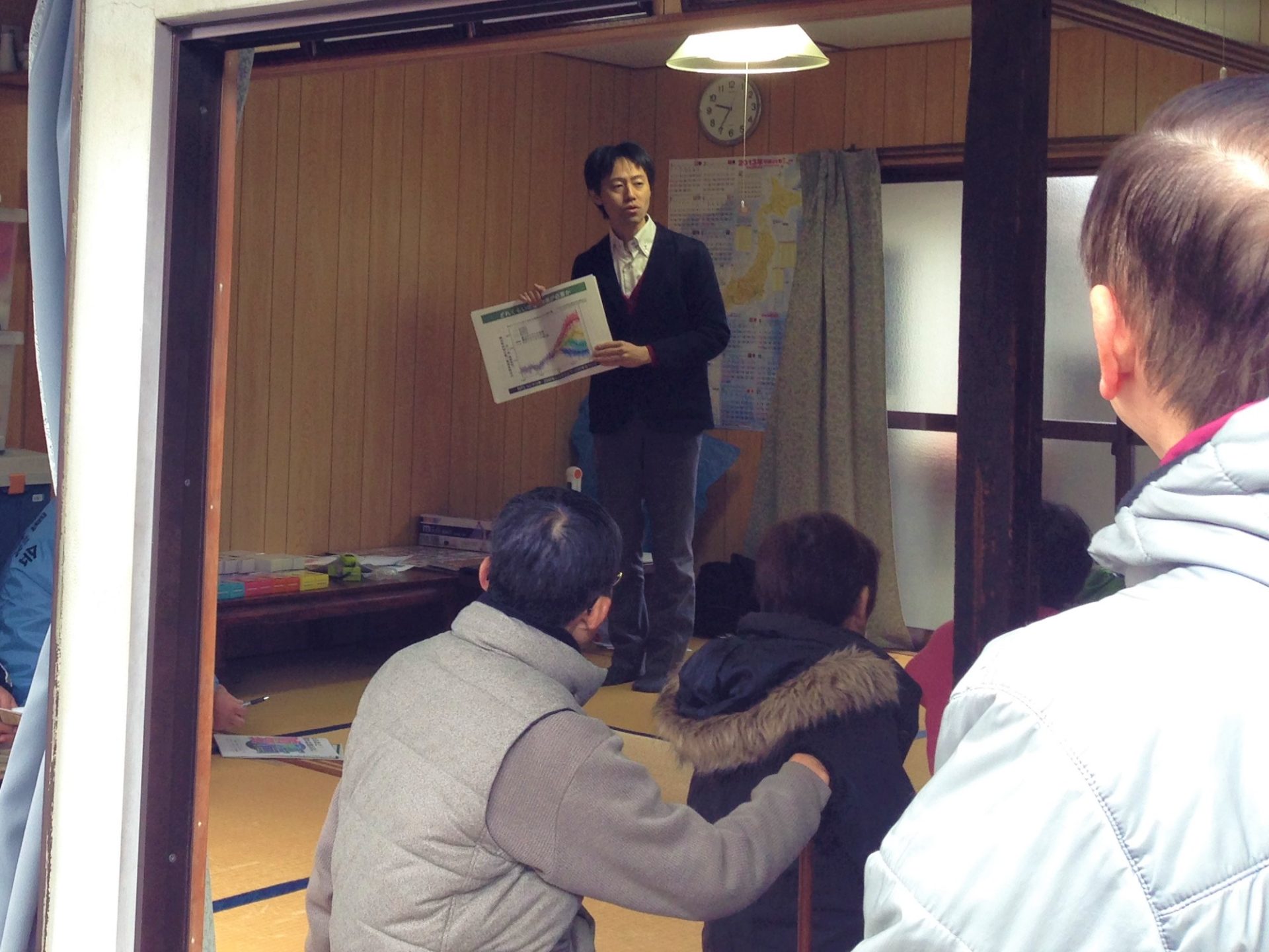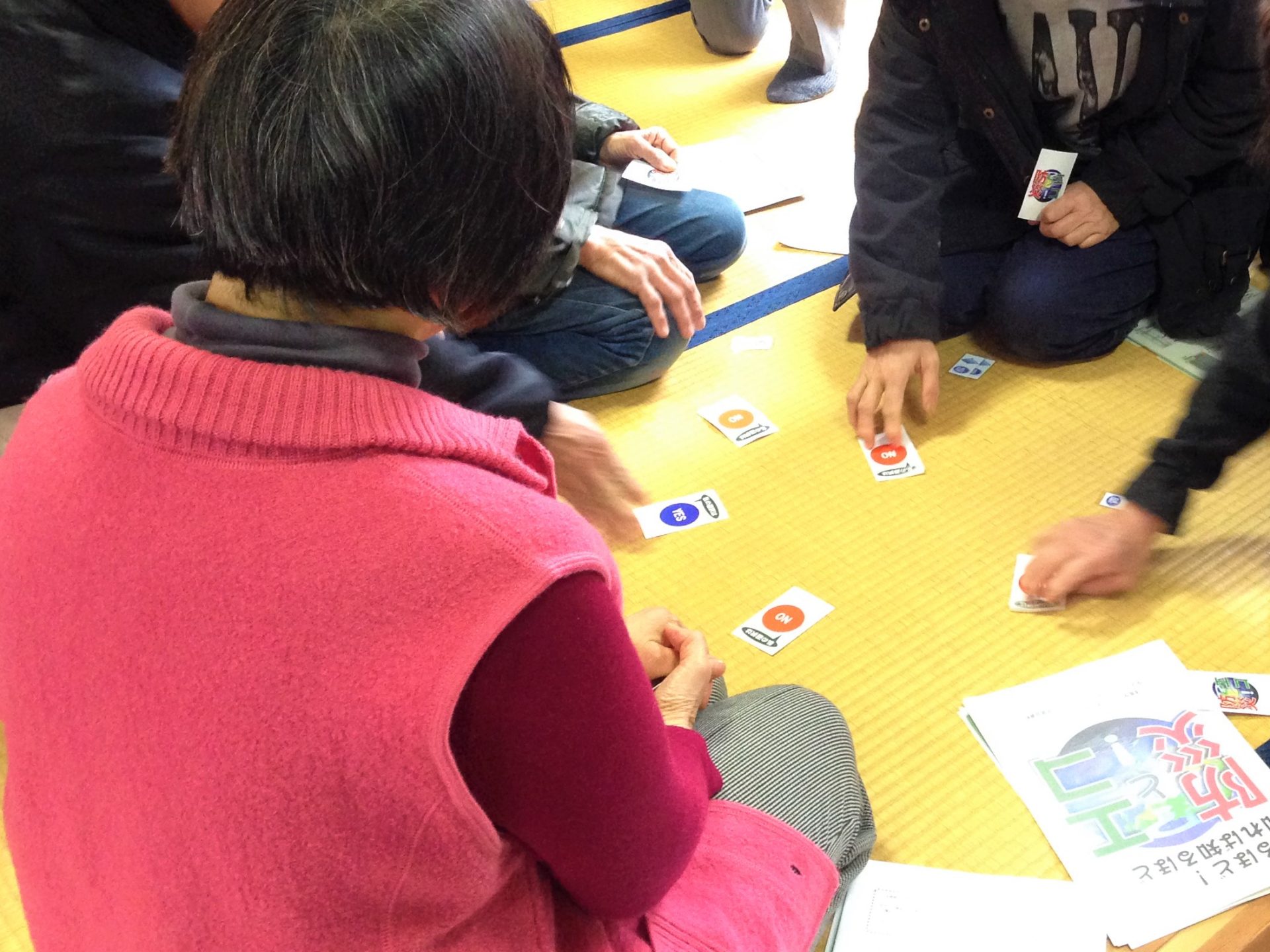 | 様子 | 消防署職員により防災学習会に併せたエコ学習を実施しました。5人のグループに分かれてのクロスロードゲームでは,設問5問に対して「YES」か「NO」のカードを提示してもらい,それぞれの理由を話し合いました。それらがどのように防災とエコにかかわっているのかを解説しました。 |