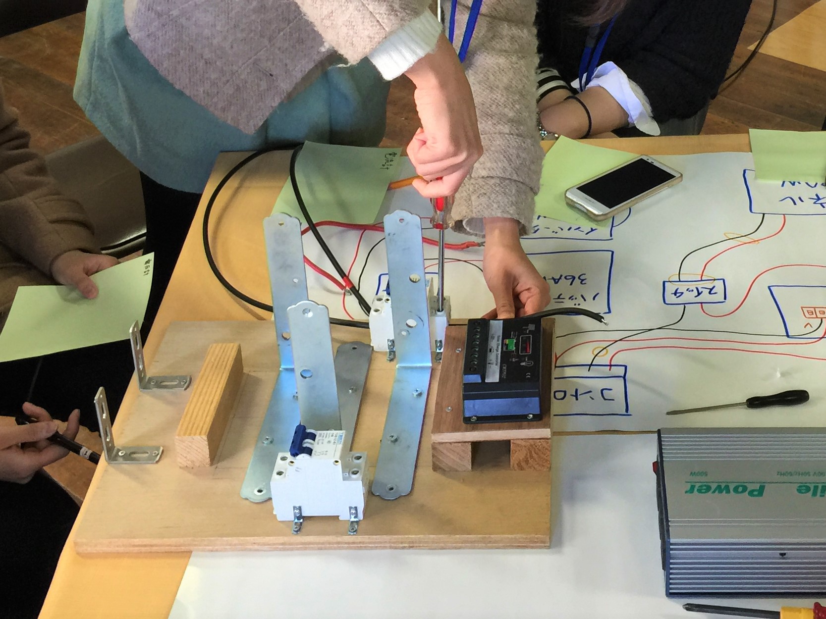 | 様子 | 独立型太陽光発電システムに必要な機器の名称と役割を復習し,ケーブルを使ってそれらの機器をどのように接続すればよいのかを学ぶ時間をつくりました。その後ケーブルの加工の仕方や工具の基本的な使い方を練習してもらい,予め準備した加工済みのケーブルを使って各機器同士の接続を,参加者のほぼ全員に体験してもらうことができました。最後には実際に発電がうまくできていることを全員で確認しました。 |