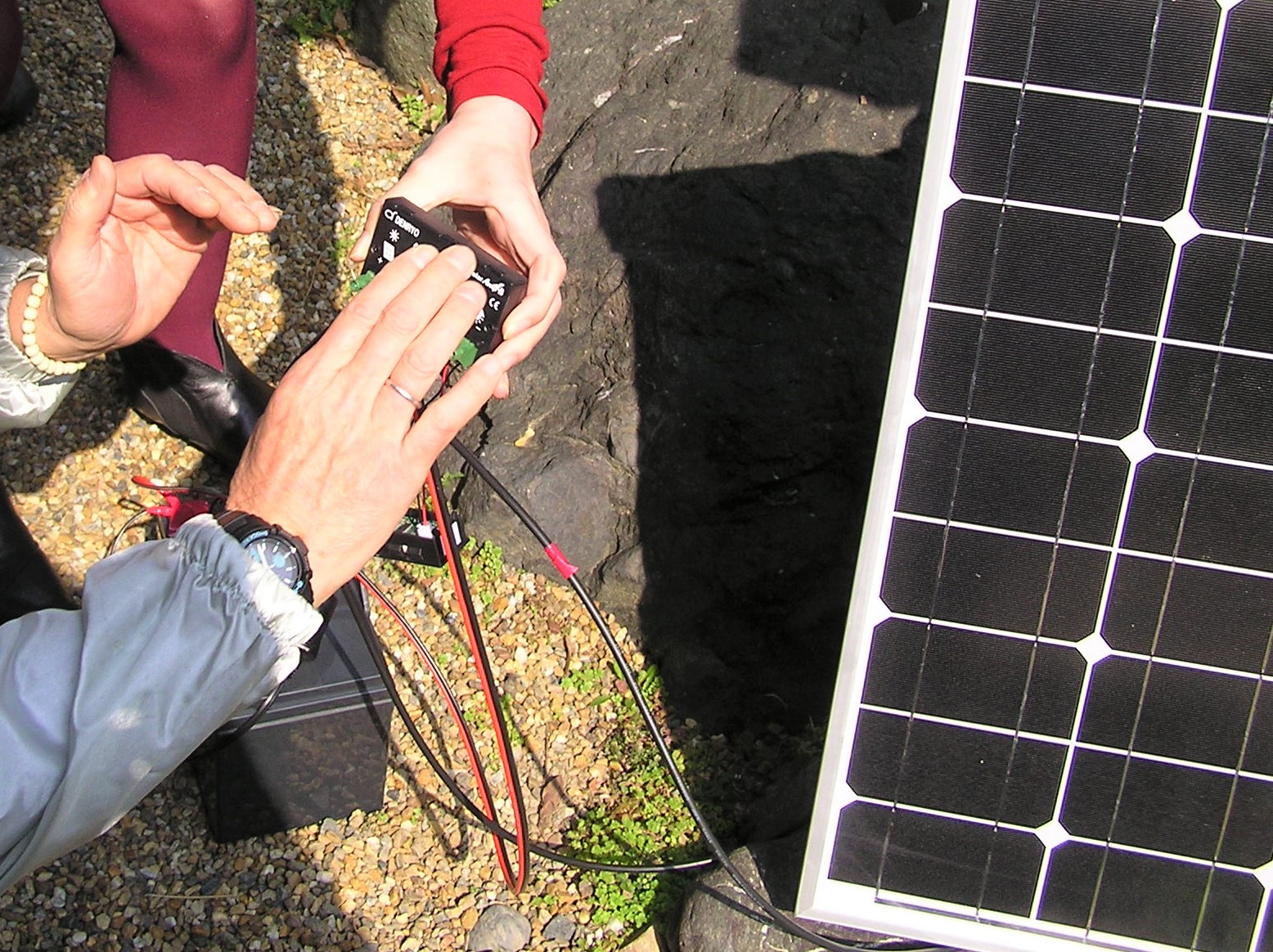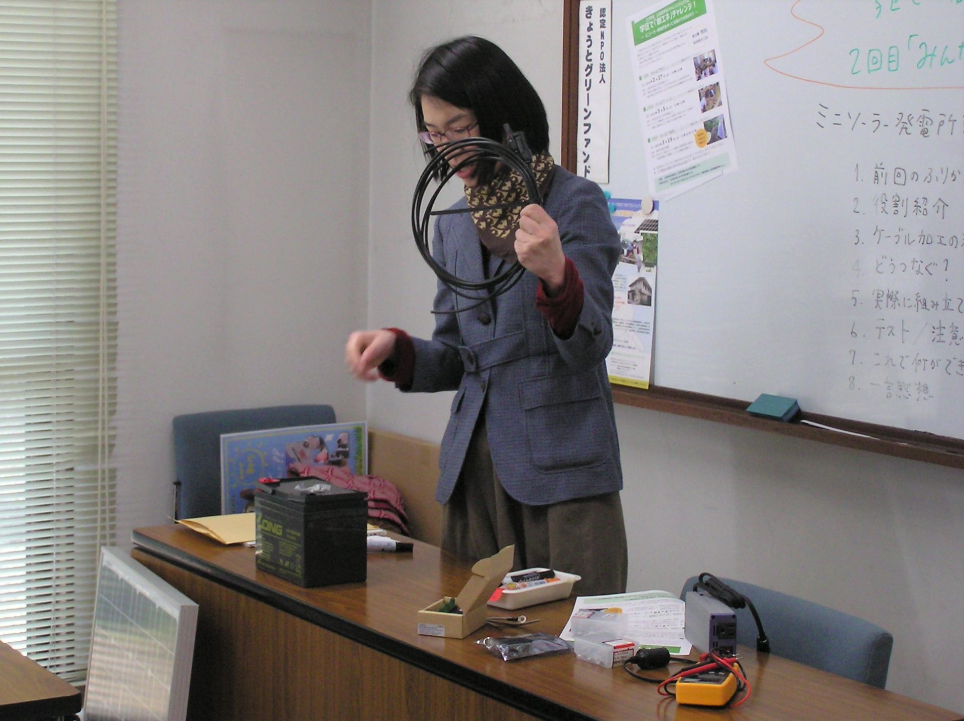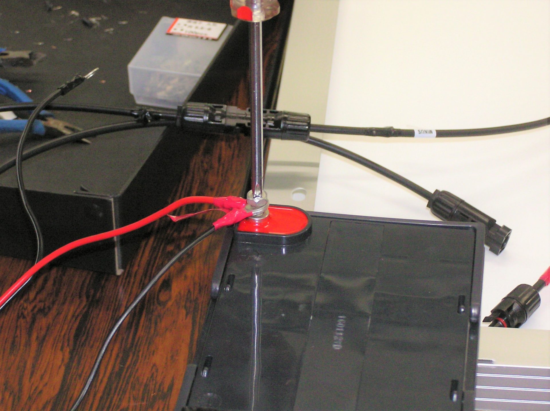 様子 前半は1回目の復習として,独立型太陽光発電システムに必要な機器の名称と役割を復習し,ケーブルを使ってそれらの機器をどのように接続すればよいのか,を学ぶ時間をつくりました。後半はケーブルの加工の仕方や工具の基本的な使い方を練習した後,本番用のケーブルを実際に加工し,太陽光発電システムに必要な機器同士の接続を行いました。最後に接続の終わった発電システムを外に出し実際に発電ができていることを確認し,最後に組み立てたシステムの基本的な使い方や注意点について説明を行いました。