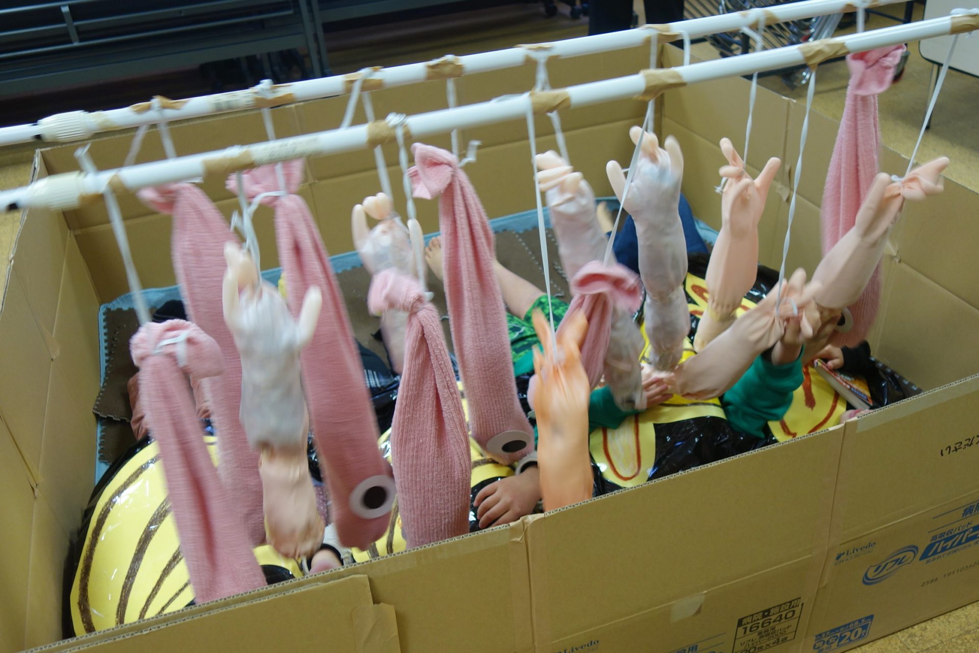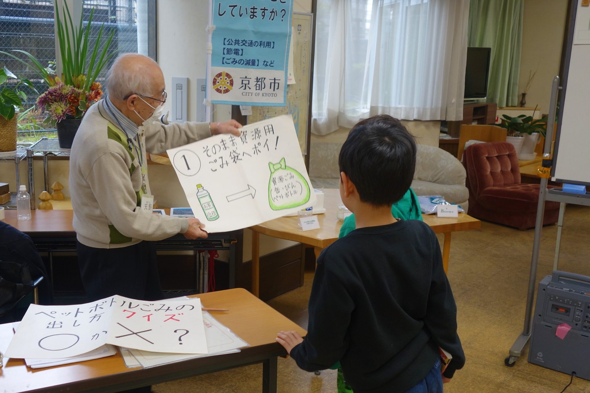 様子 子どもたちがバナナの皮やペットボトルに仮装し,児童館職員手づくりの「焼却炉」「処理施設」でごみの一生を体験した。その後スライドを使った学習会で,楽しくごみの分別や3Rについて学んだ。講師,児童館職員,桃山エコ推進委員会メンバーと打合せを重ね,当日も役割分担して,新しい学習プログラムを創り出すことができた。参加した児童及び保護者から,学びが多かったという感想をいただいた。
