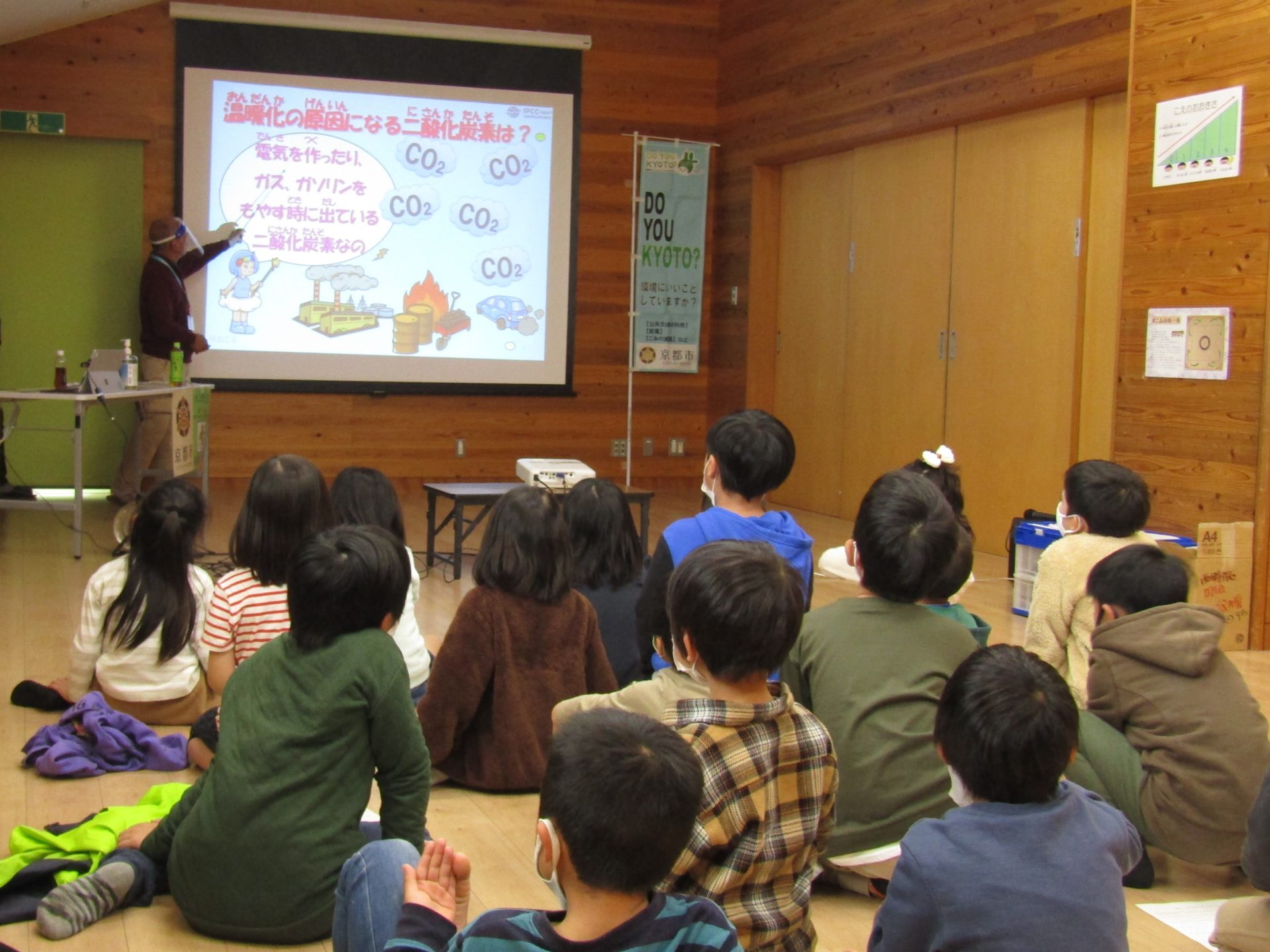 | 様子 | 「1年生のグループ」「2年生以上のグループ」の2組に分けて,30分ずつ学習会を実施しました。地球温暖化の仕組みや,CO2を出さない家の特徴について話した後に「ぐー・ちょき・ぱーでエコクイズ」をしました。「水を使うとCO2が出るかどうか。」というクイズには約半分の子どもたちが「出ない。」と回答していたが「水を蛇口まで引き込むためにエネルギーが必要で,CO2が排出される。」という説明を聞いて,納得していました。 |