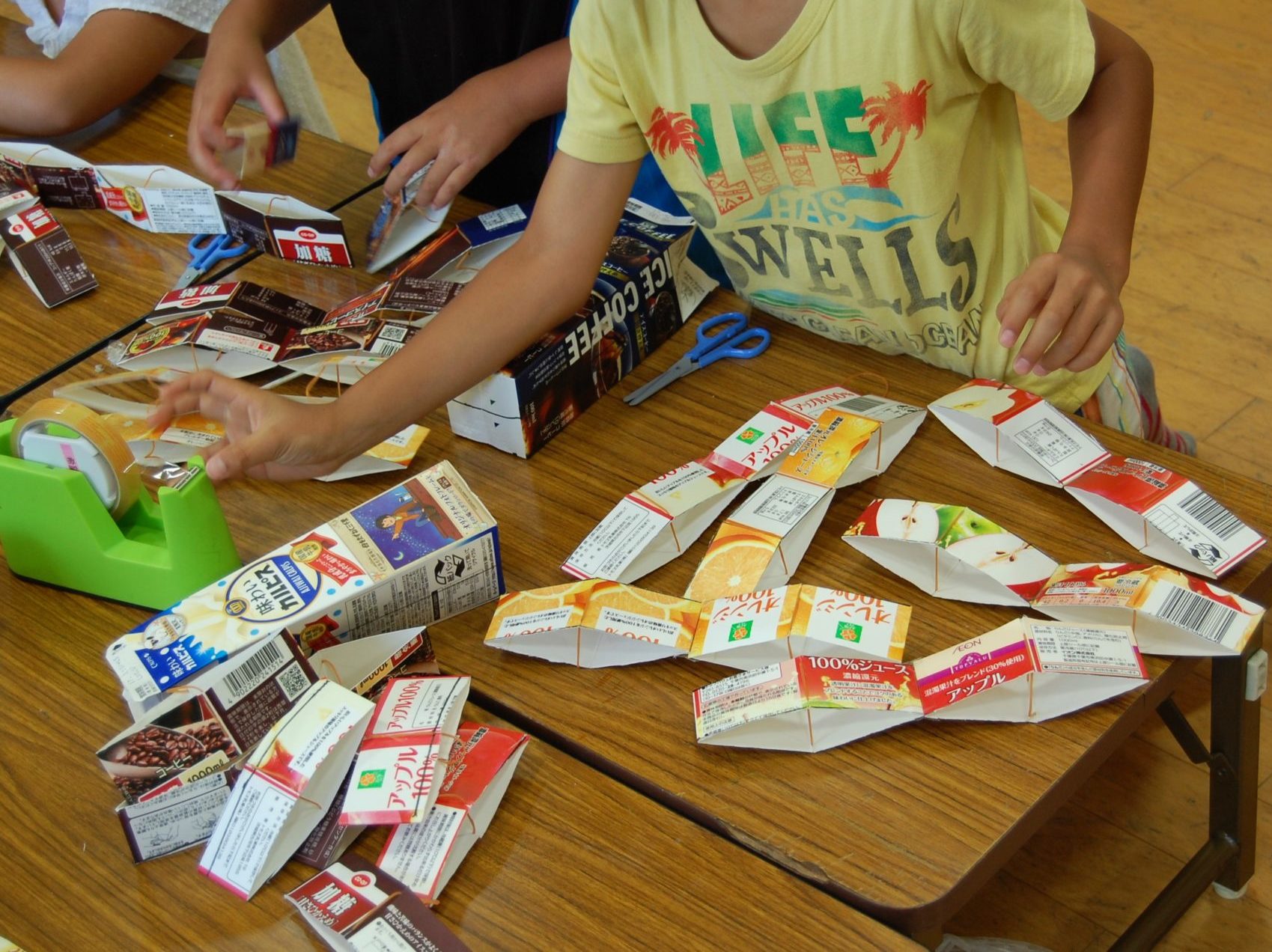 | 様子 | 牛乳パックを使ったリユース工作は1年生から6年生までが参加し,びっくり箱を作成しました。講師からは「牛乳パックはどのようにして作られているか?」「材料は何で,どこの国から来ているか?」「そうすることでどんなエネルギーが使用されるか?」などクイズを交えながら対話形式でわかりやすく児童に伝えました。またリユースすることで,ごみの削減と温暖化防止にもつながる事を学びました。地域で活動されている方も学習会の様子の見学に来ていました。 |