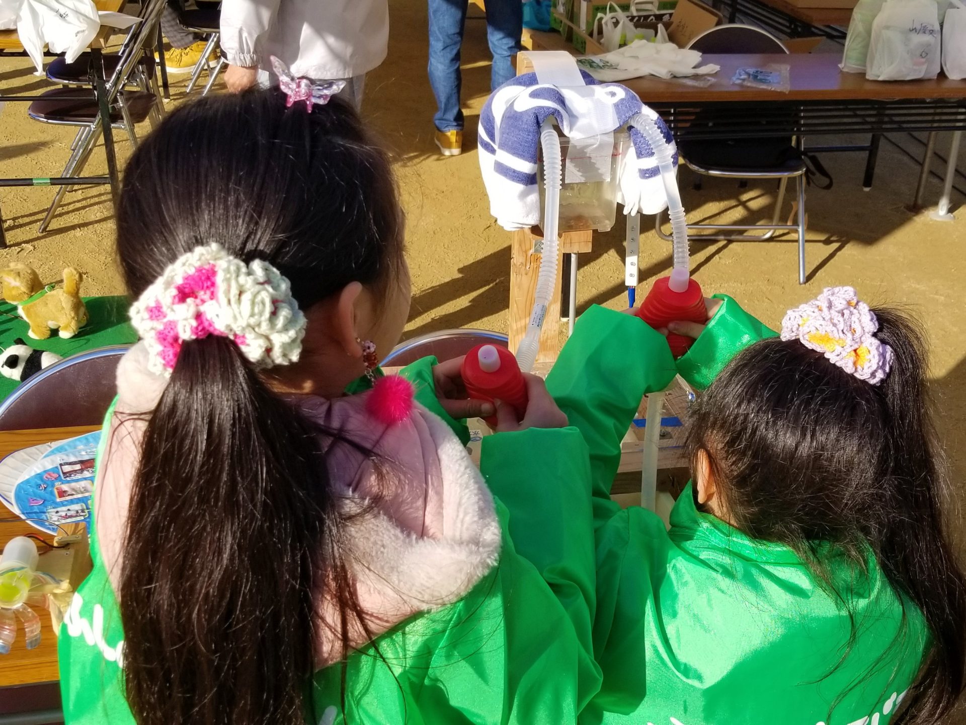 | 様子 | ブースでは4種類(水力発電・風力発電・手回し発電・自転車発電)の発電体験を実施し,3歳児から高齢者まで幅広い年代の来場者が参加していただけた。 エコクイズでは,学校で環境の授業を受けたことのある4年生や5年生が「この問題知っている!」と学んだことを思い出してクイズに答えていた。 |