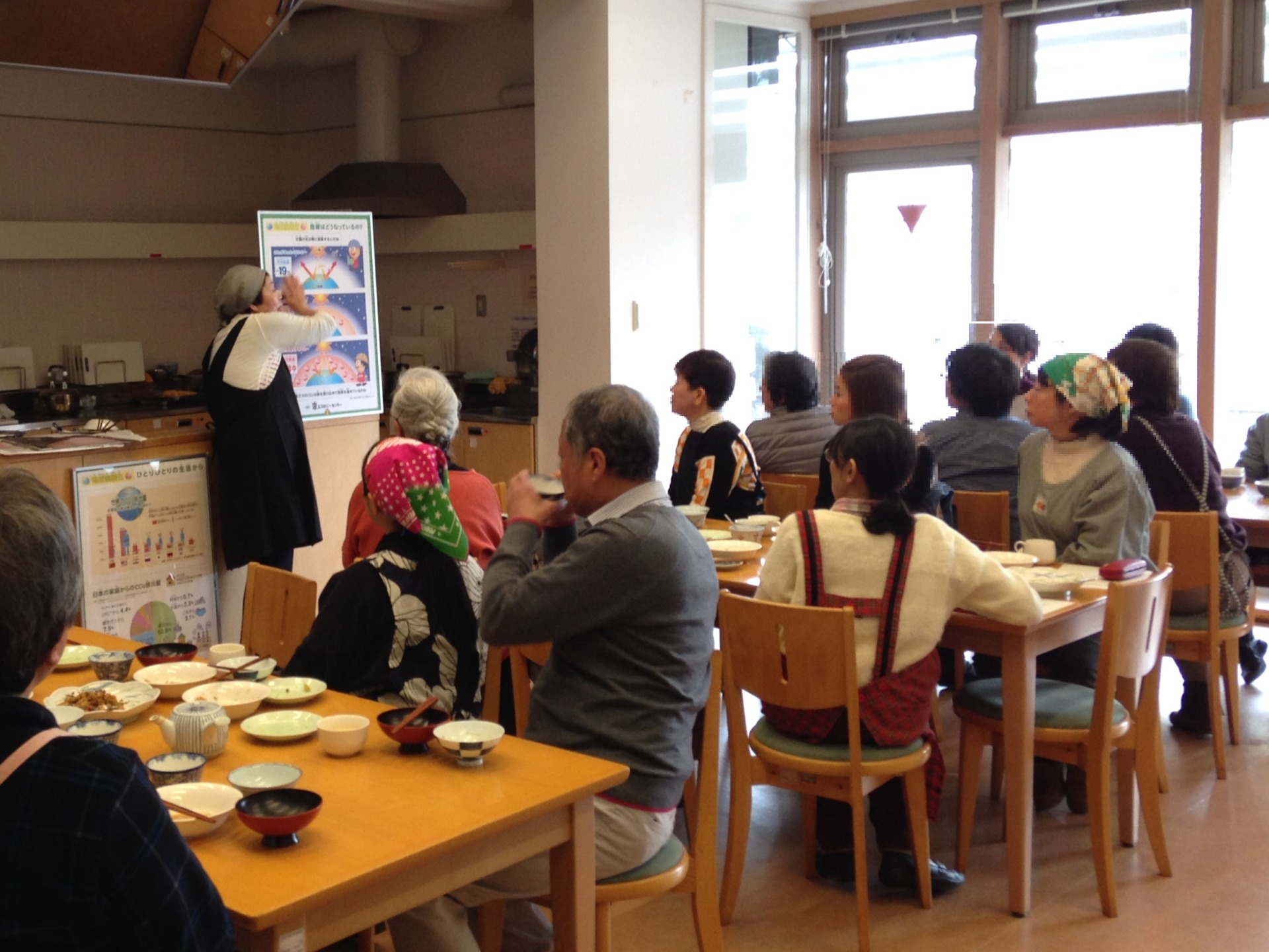 | 様子 | 事前呼びかけもあり,子育て世代の若い方も何人か集まりました。料理教室は各グループの特色がありながらも,参加者同士が協力して3品を完成することができました。調理途中では,食材の栄養についての話がありました。 みんなで作ったご飯を食べながら,地球温暖化について今年の台風の被害など,講師の自宅周辺の写真を見せながら説明し,簡単にできる生ごみコンポストなども紹介しました。 |
