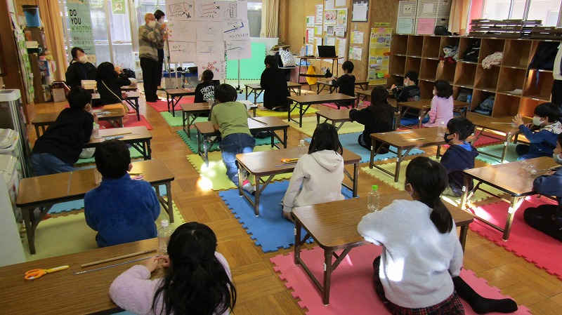 | 様子 | 前半は講師がスライドを用いて地球温暖化やごみ分別・減量について説明を行い,「リサイクルに出したらどうなるのか。」「容器包装は何で中身をきれいにしないといけないのか。」など,児童たちから出された質問に回答しました。講師から児童たちに質問すると,多くの子どもたちが挙手をして,積極的に自分の意見を述べていました。 後半はペットボトルを使ったリサイクル工作を行い,児童たちは児童館職員と講師の手を借りながら,自分だけのオリジナル風車を楽しそうに作っていました。 |
