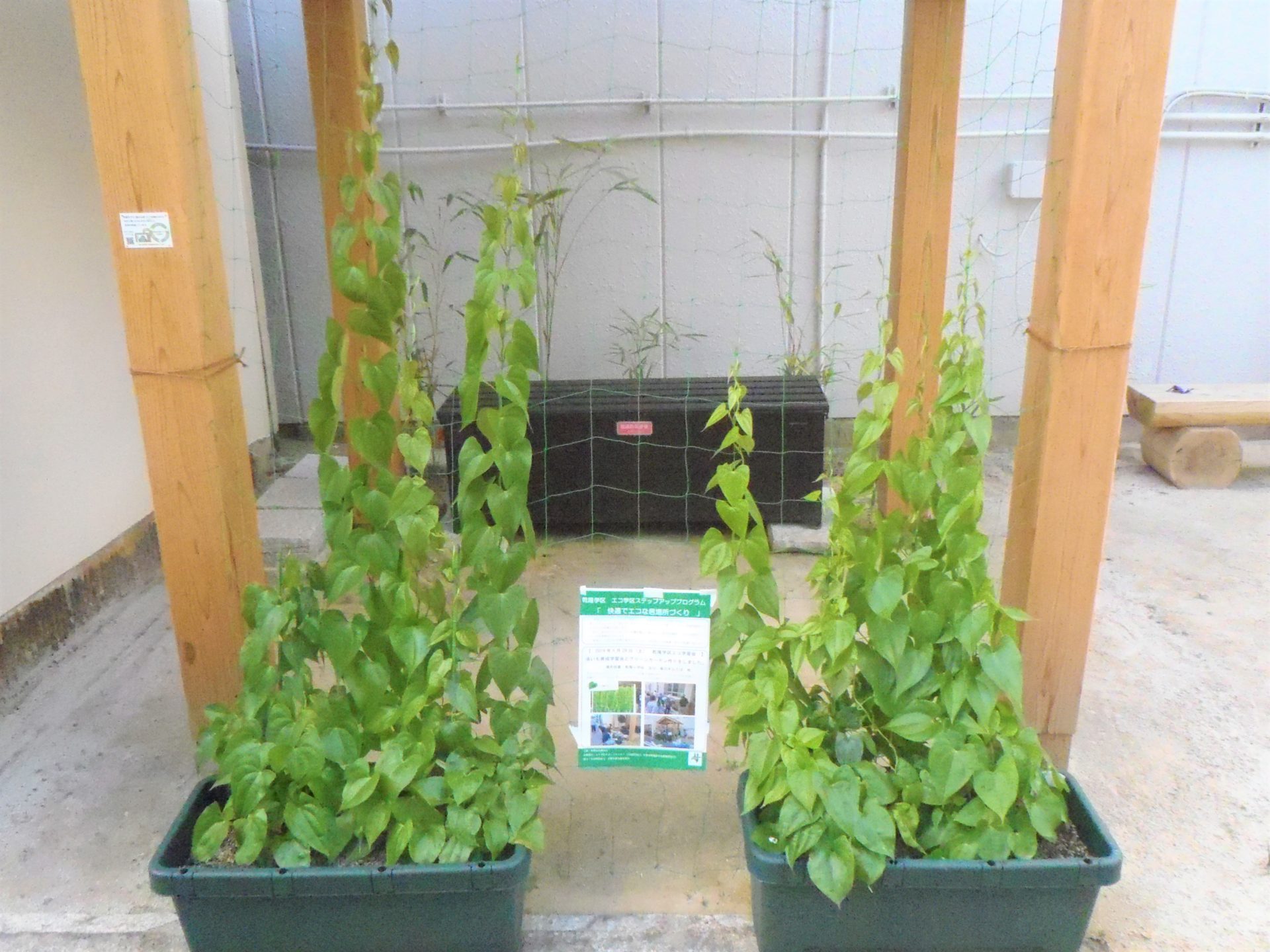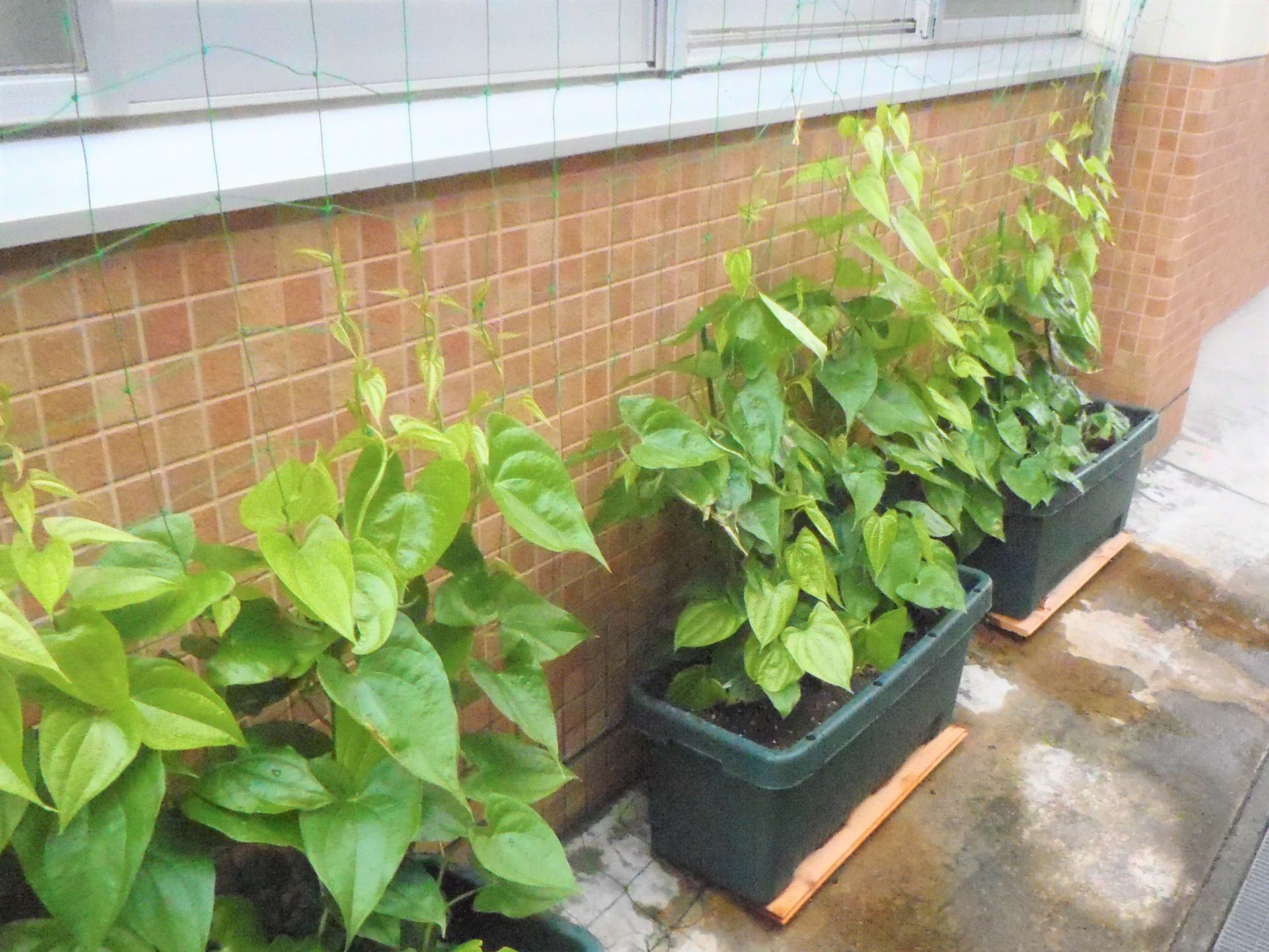 内容 グリーンカーテン(洛いも)の発育状況を確認し,必要な手入れ方法をアドバイスする
