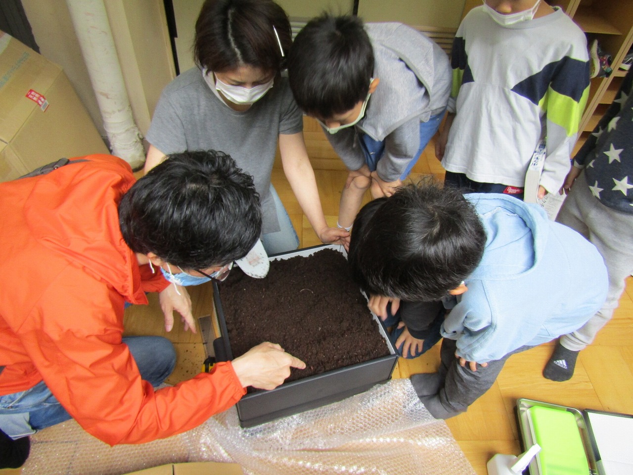 | 様子 | 当日は担当の先生二人とコンポストの組立を行いました。学童へ来ていた子たちが数名おり「これはなに?」と興 味を示してくれました。先生方が「ミミズで堆肥を作るんやで。」と教えてあげると「え~なにそれ?」と不思議そうにしな がらも喜んでいるようでした。ミミズを袋から出すと子ども達が寄ってきて直接触っている子もいました。先生方は堆肥 づくりに意気込んでくださっているようだったが,ミミズが苦手なので子ども達に「みんな手伝ってな~。」と呼びか けてくれていました。 |