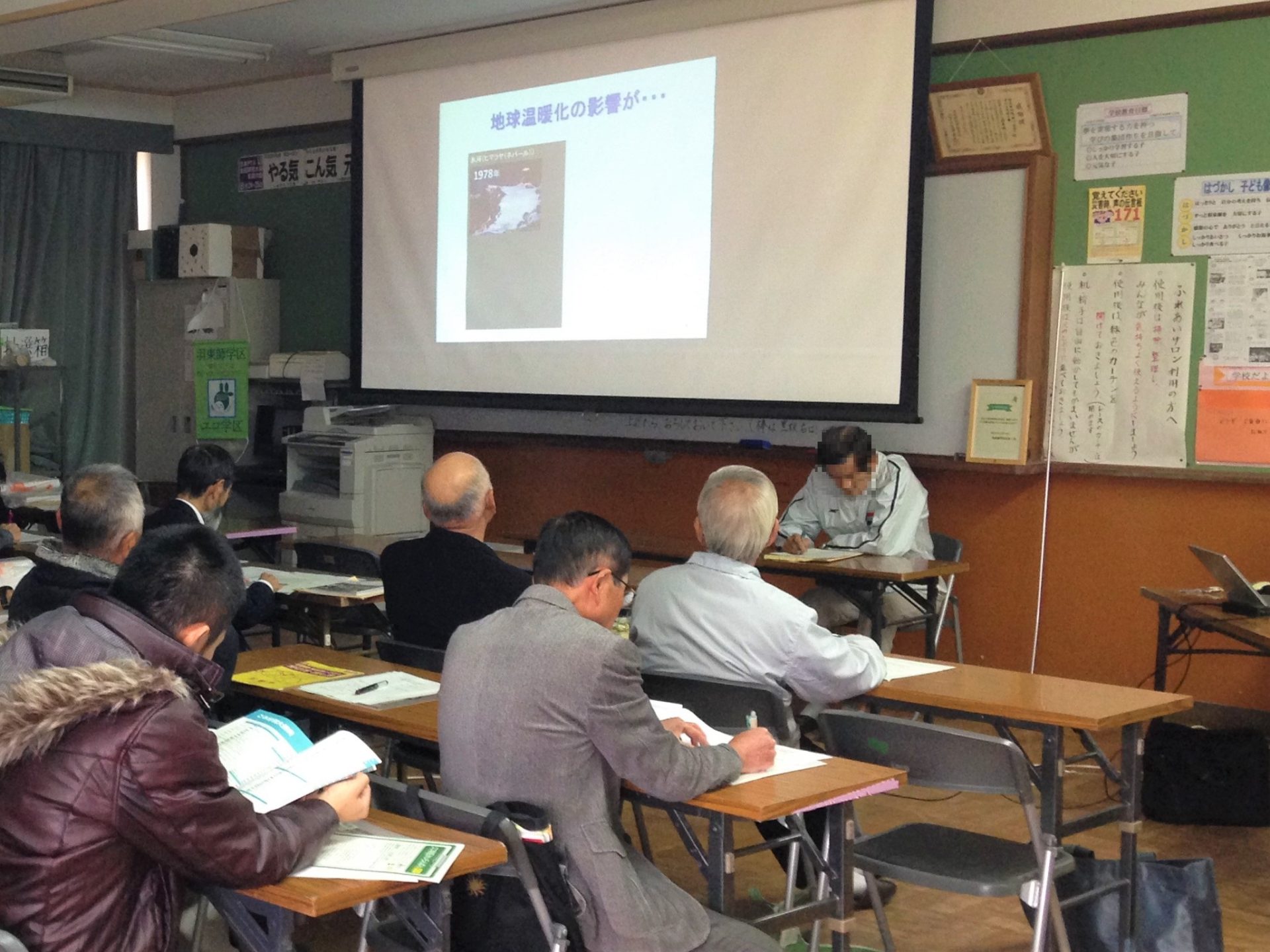 | 様子 | 役員会の一部としての開催で参加者は男性が中心となった。 こまめにメモを取って下さるなど,省エネ方法や最新機種の性能についての質問もいただき,関心を持っていただけた学習会となった。 |