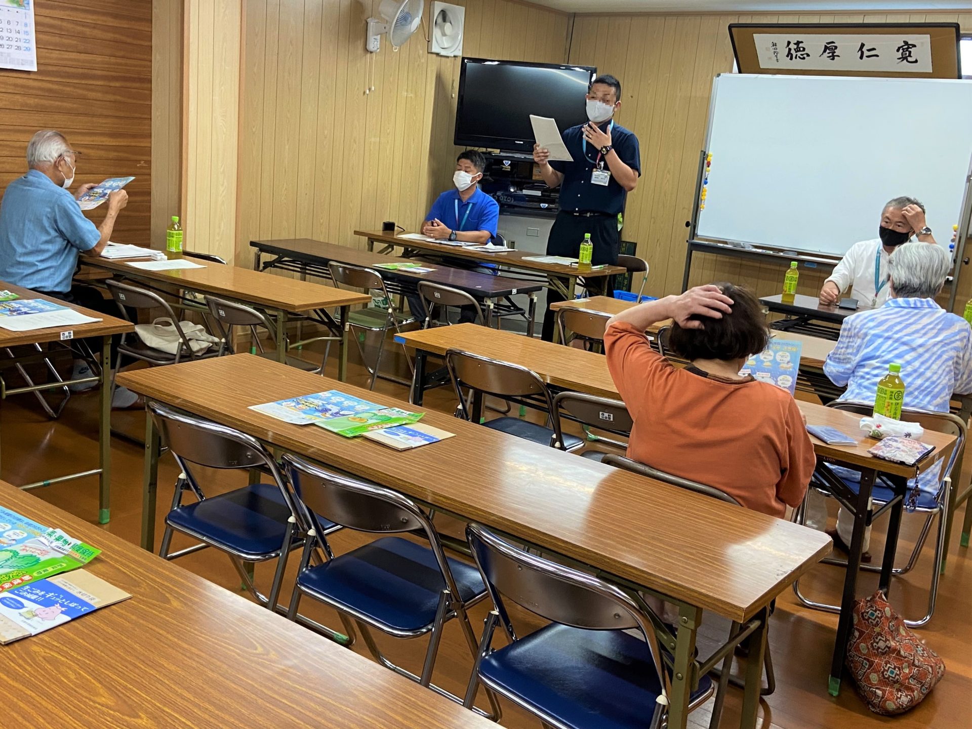 | 様子 | 環境啓発冊子を使って学習会を実施しました。コロナ禍の中ではあったが役員の方々に集まっていただき,前年度の公会堂のHEMS導入とLED化の振り返りとIPCC京都ガイドラインに従い気温上昇を1.5℃までを目指す必要性を説明しました。「これからの子どもの暮らしが心配になった。」と感想があり,地域に住む子どもたちのためにも,これまで通り省エネライフに取組んで行くとのコメントをもらいました。 |