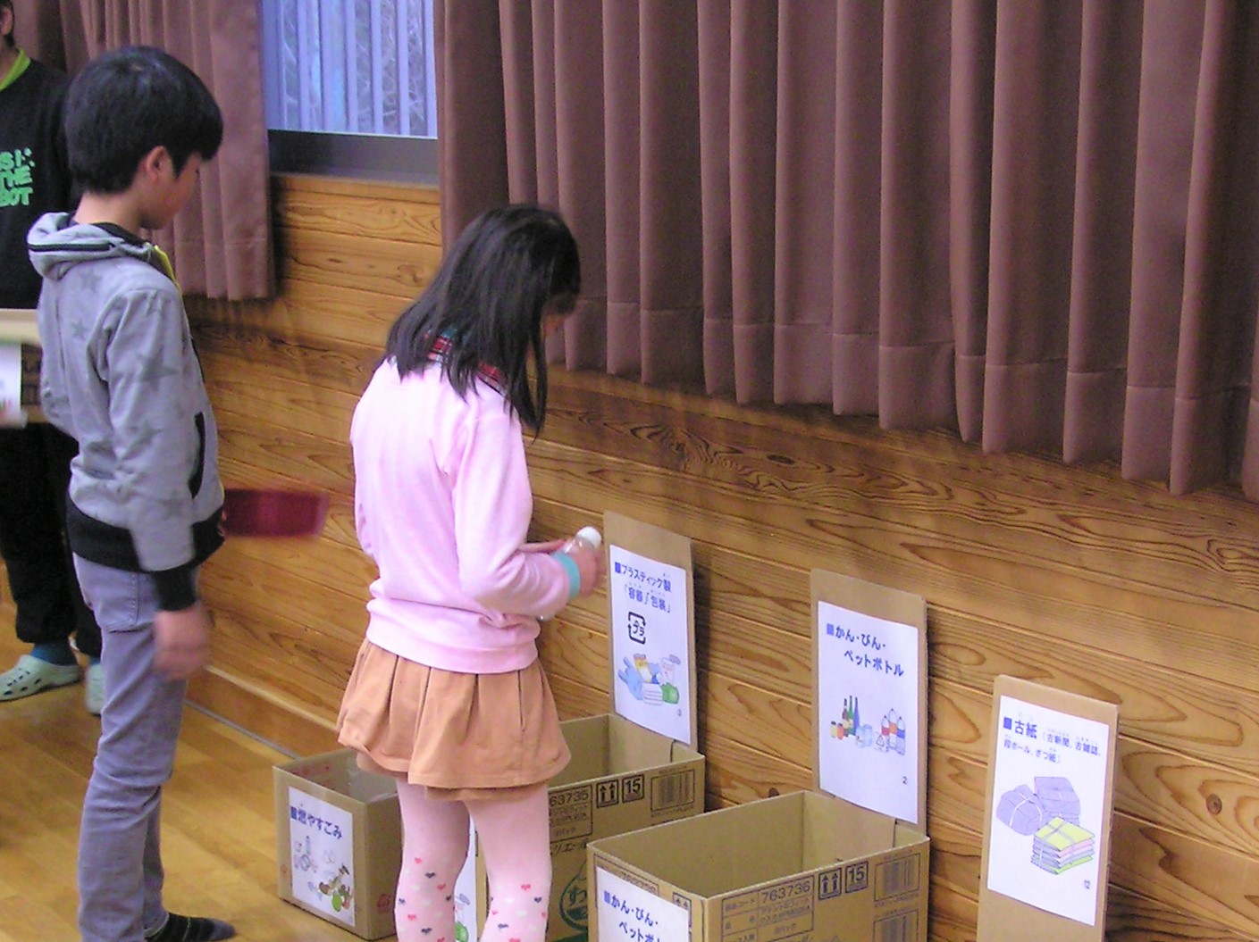 | 様子 | 子ども達は日頃ごみの分別を家庭で実践しているようで,ごみ分別ゲームでもその経験を活かしながらごみ分別を理解できていた。 京都市ごみ分別資料の配布をし家に帰って親子でさらに理解を深めてもらえるようにした。 |
