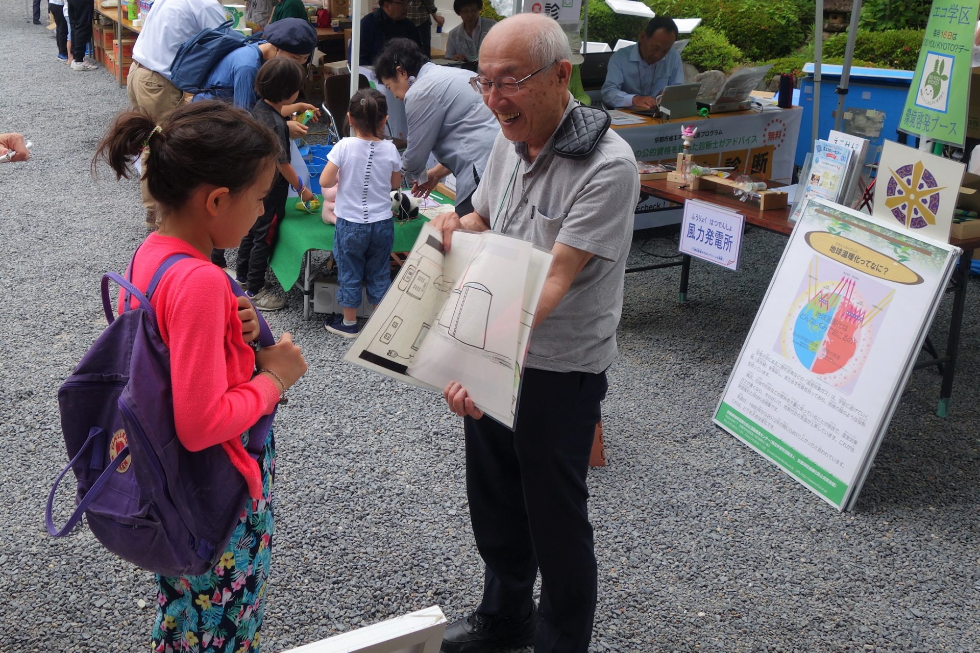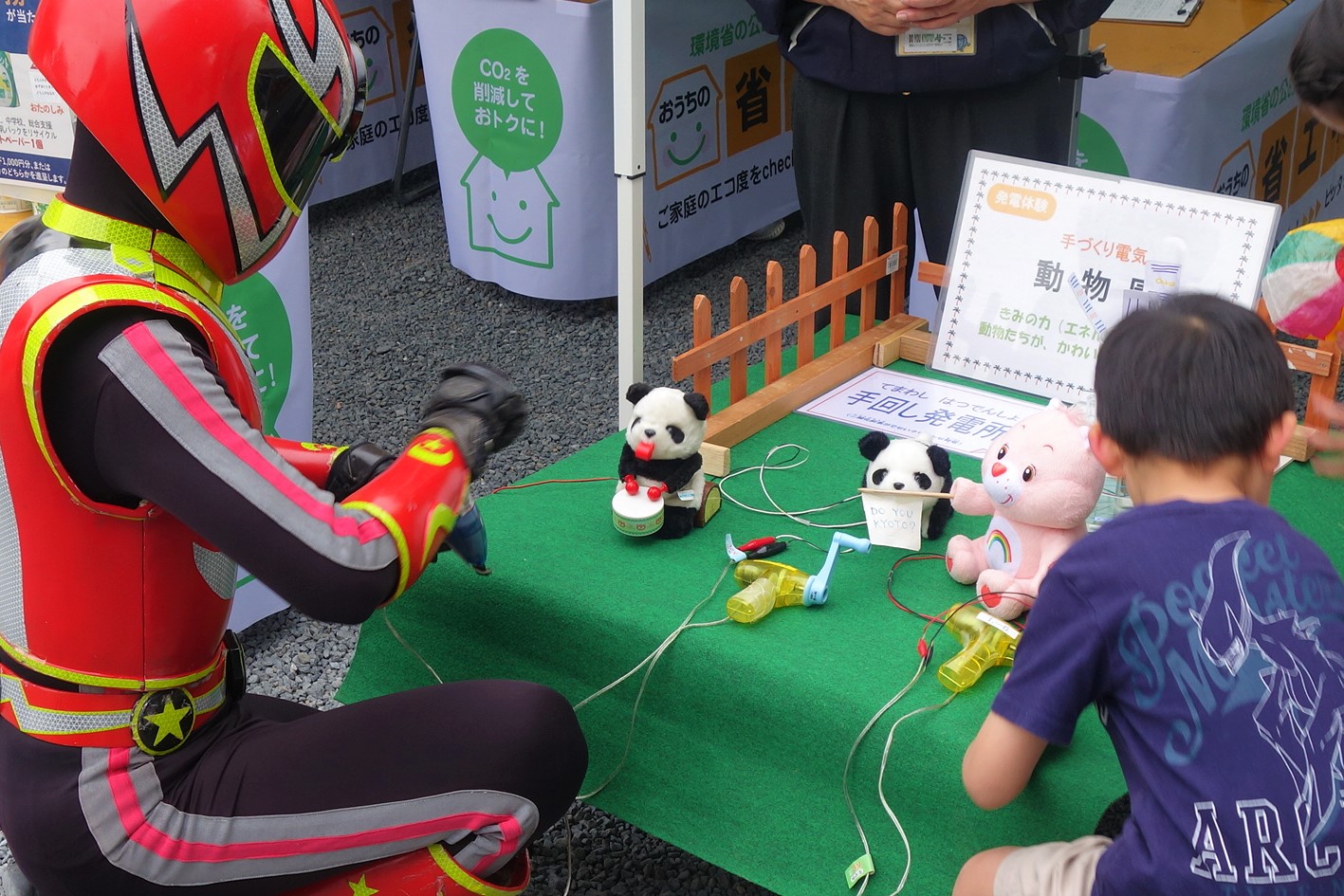 | 様子 | 会場には小学生や大勢の親子連れが訪れており,エコ学区のブースにもたくさんの方が集まりました。立ち寄られた方々は,展示していた太陽光パネルや風力発電の仕組みを考えたり,自然エネルギー発電体験を楽しんでいました。 豊園エコ推進委員の小学生とPTAの方より,豊園学区でのエコ活動や地球温暖化の話があり,集まったたくさんの方が聞いていました。参加した4年生の女の子から「発電のお話面白かった。」という感想がありました。 |