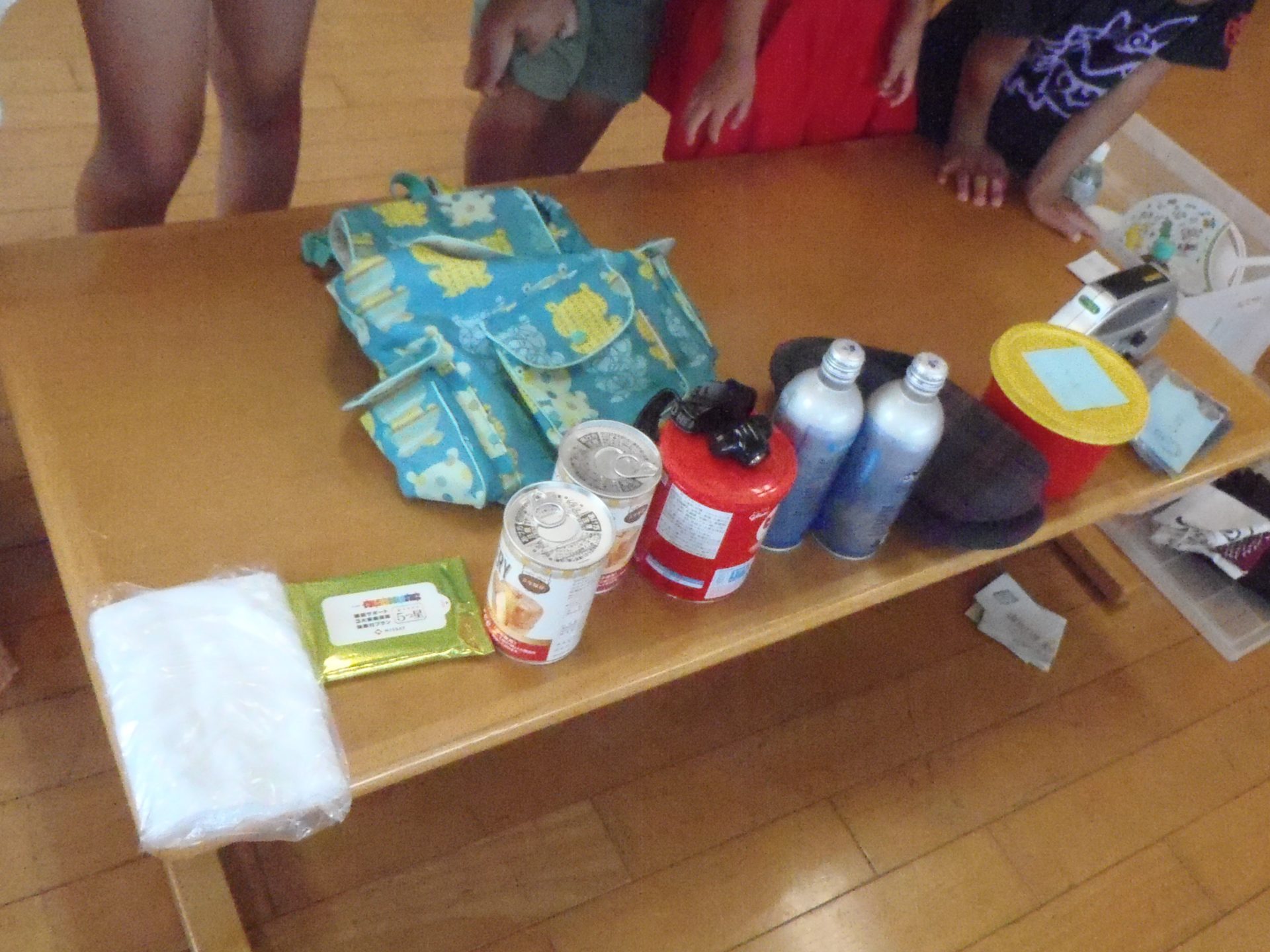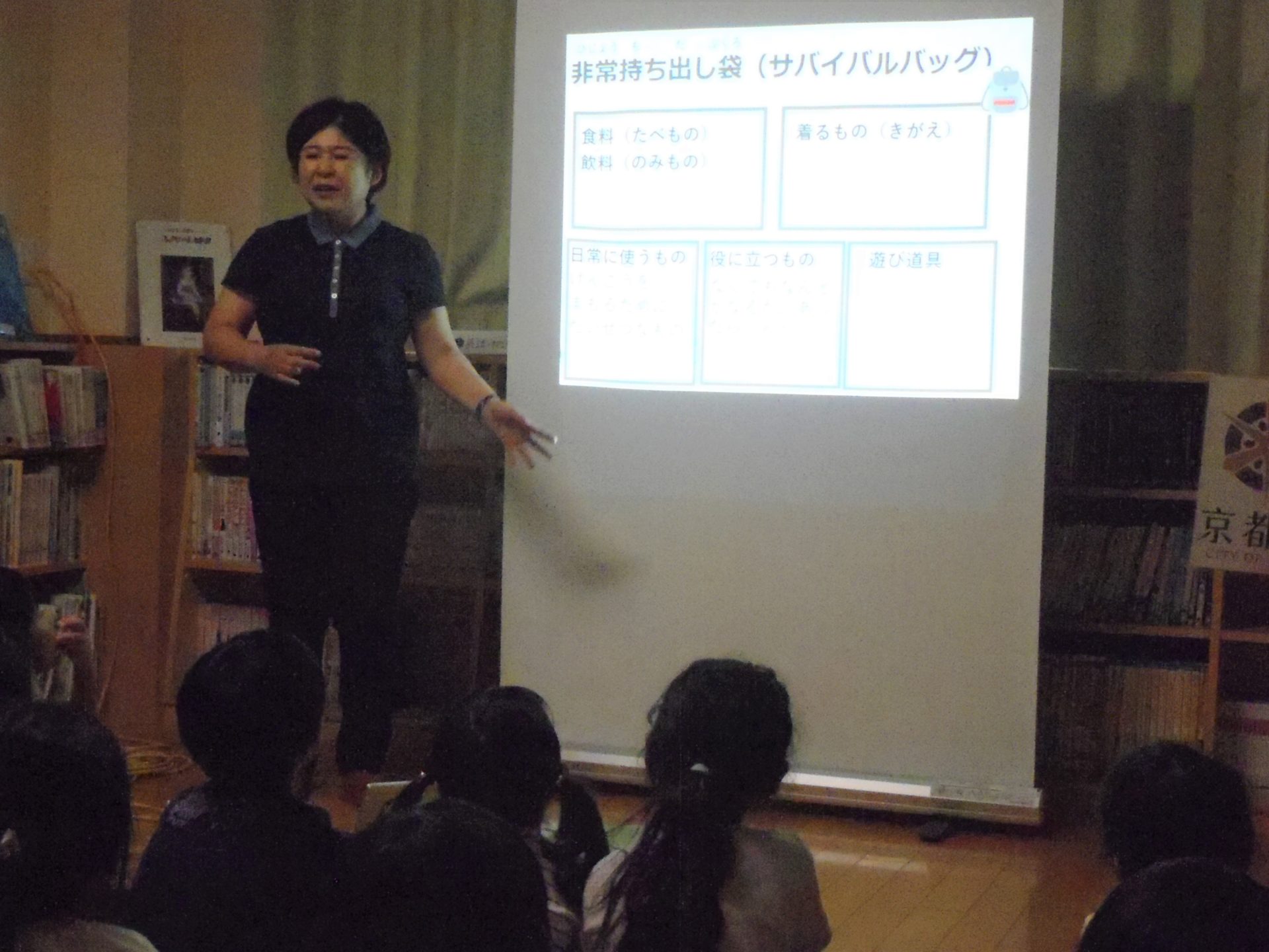 参加者は,児童館に通う低学年の児童で,地球温暖化の話を初めて聞いた子どもがほとんどでした。学習会では,自分たちの生活と地球温暖化の関係を伝え,地球温暖化を知ることができて良かったという感想がありました。非常持ち出し袋のワークショップでは,災害時に持って行くものをグループで話し合い,実際にリュックに入れて重さを体感し,持ち物に選んだ理由を他のグループに発表しました。発表することで,子どもたちは,エネルギーの大切さを再認識していました。新聞紙スリッパのワークショップでは,とても楽しそうに作り,それぞれ履きやすいように工夫していました。今回の学習会で学んだことを家庭でも話し合ってもらえるように「いざというときのそなえ」という用紙を参加者に渡しました。 |