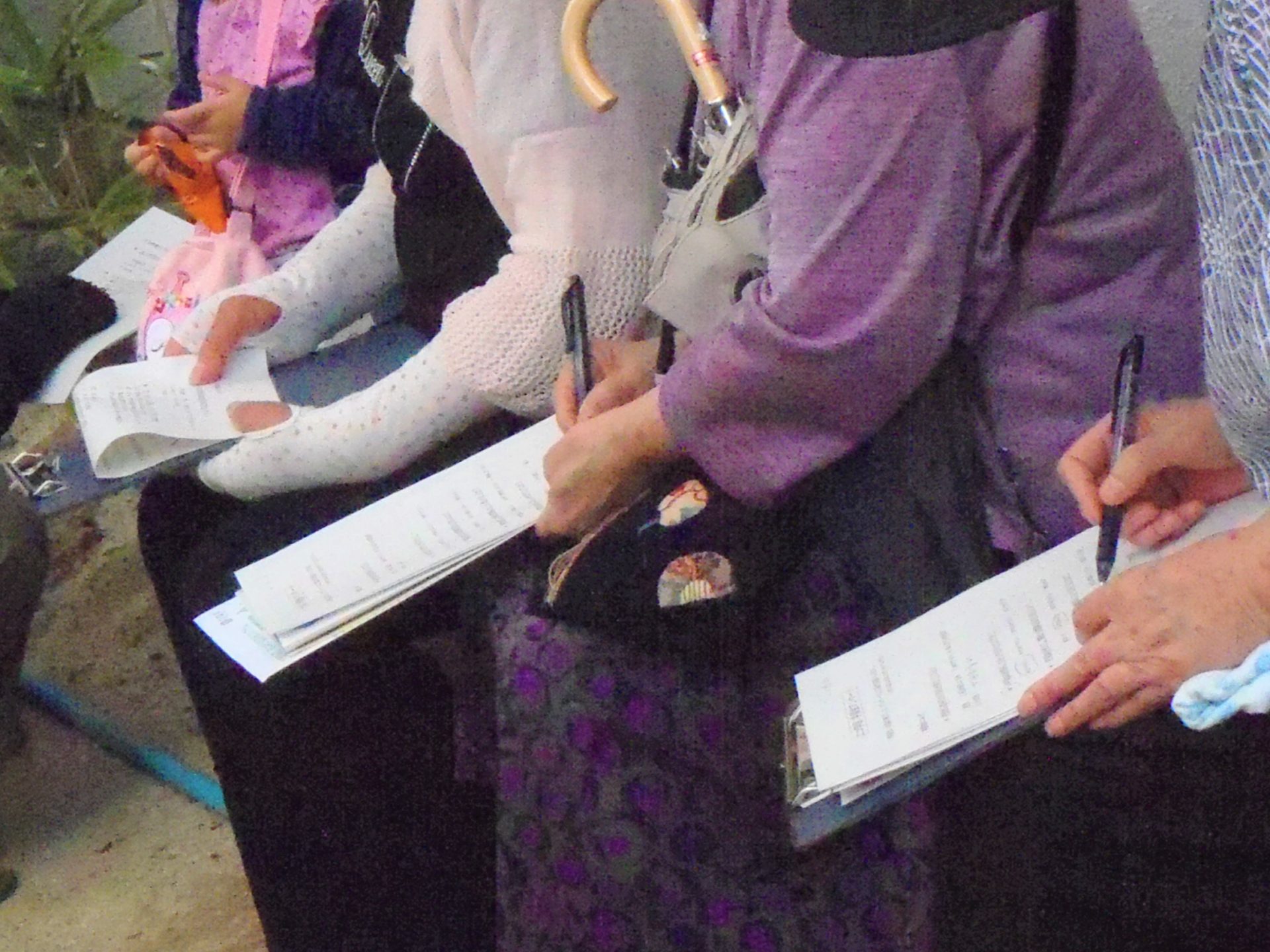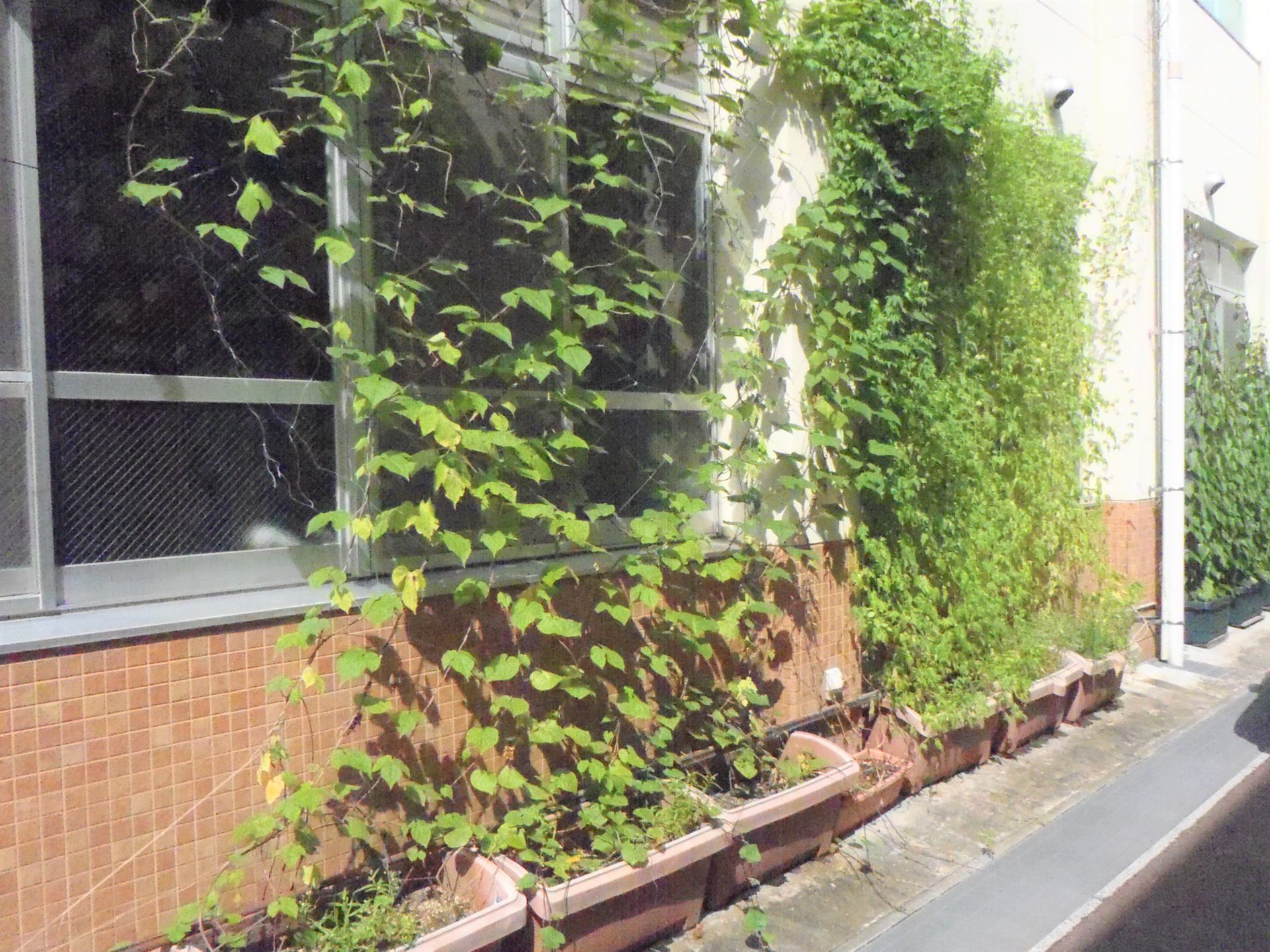 | 様子 | 乾隆小学校,桑の木ひろば,女性会メンバー宅,それぞれのグリーンカーテンはいずれも葉が生い茂りました。苗の植え付けが1ヶ月遅かったこともあり,少し背丈が低い傾向にあるが問題ないとのことで,葉も大きく成長しグリーンカーテンの役目を果たしていました。今回の活動により,グリーンカーテンによる室温調整が省エネになるということを再確認しました。通りがかった桑の木ひろば付近の住民の反応もよく活動に関心を持っていました。 |