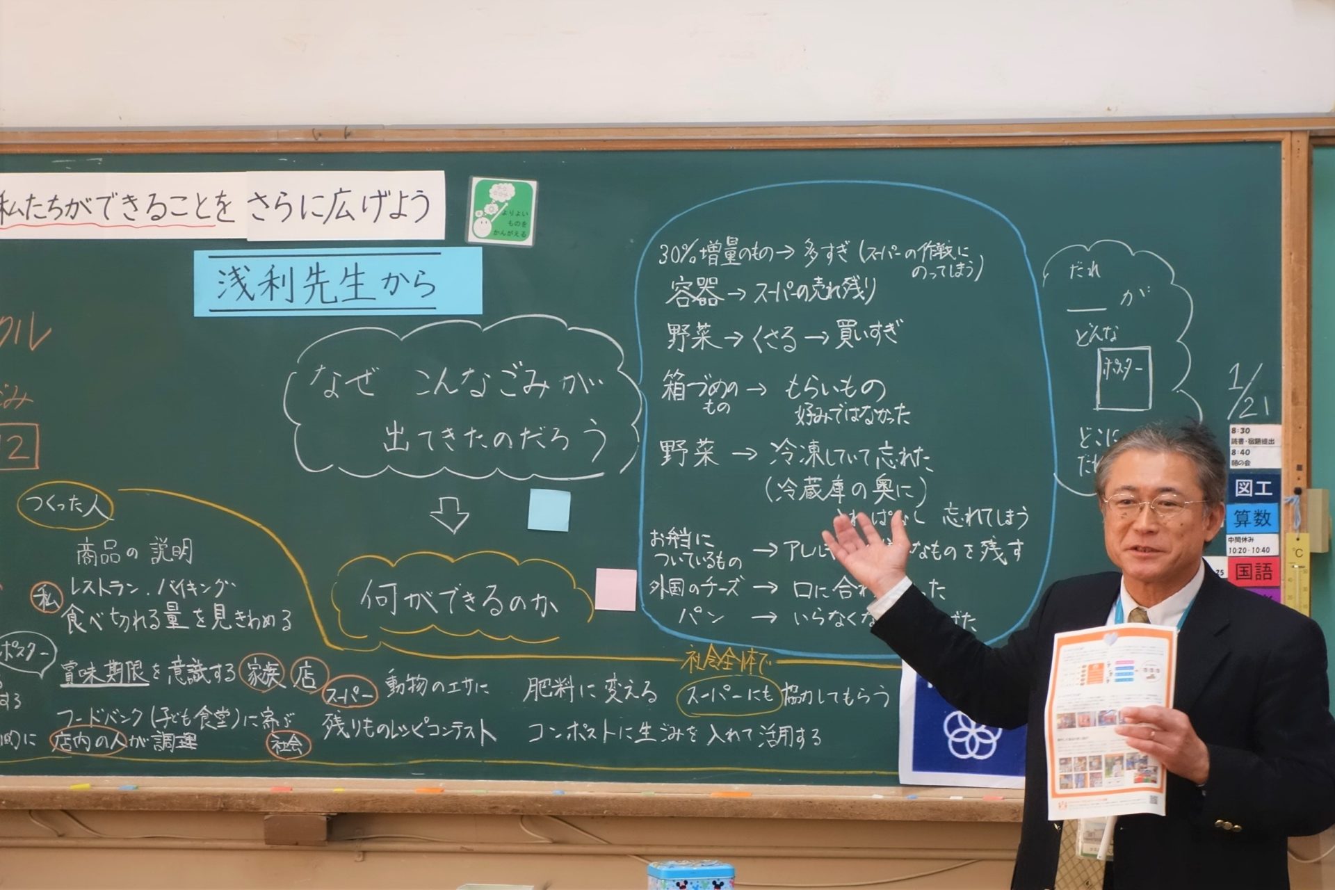 | 様子 | 講師がSDGs授業の振り返りをした後,「フードロス」にスポットを当て,自分たちでできることについて話し合いました。その後,自分たちだけでは解決できない課題(贈答品などによる食べきれないもの)について,1つの解決策としてフードドライブを紹介し,2/14(金)に地域と協働して実施することを伝えました。 |