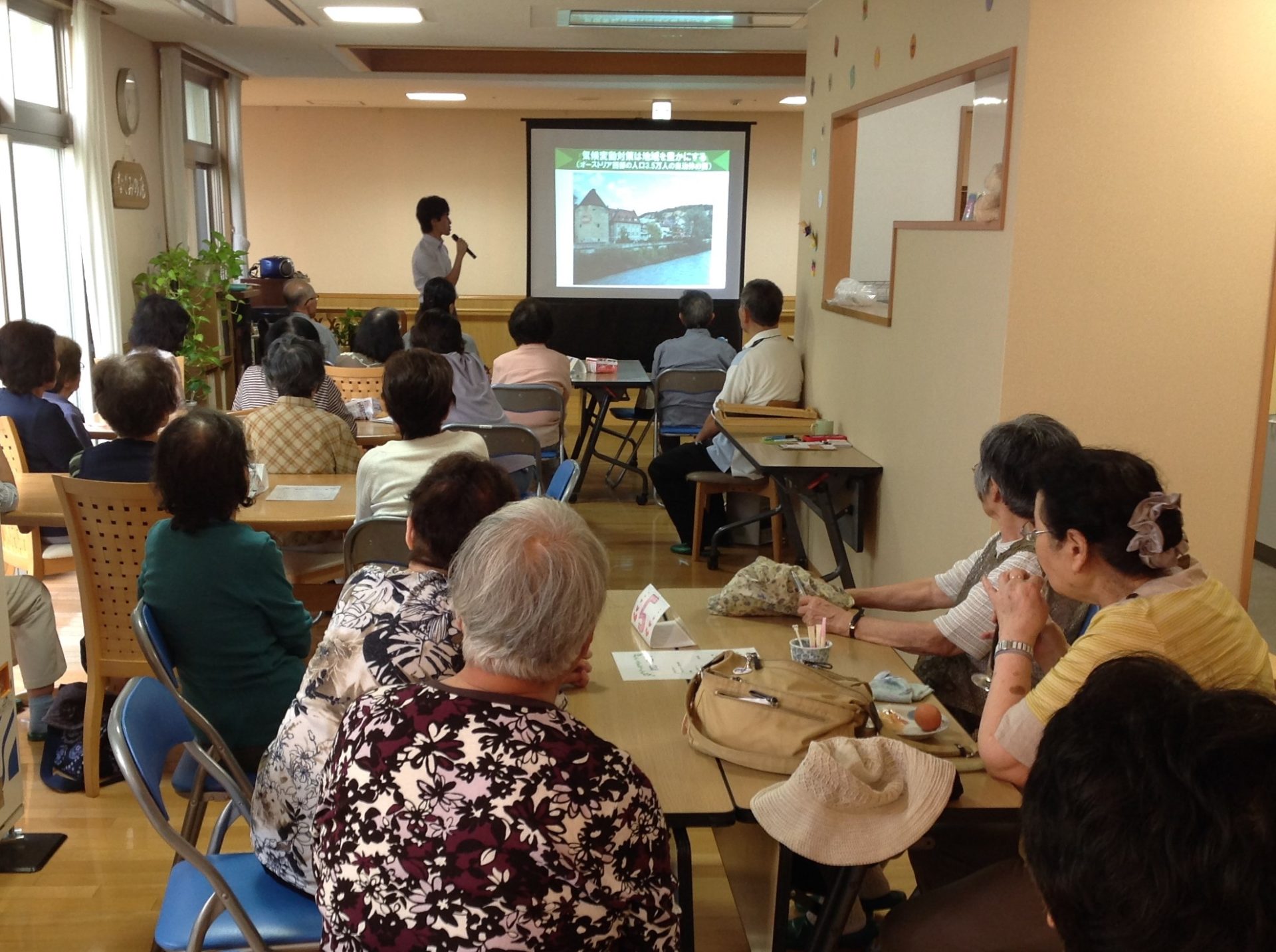 | 内容 | ・海外の地球温暖化防止の取組の紹介と鷹峯学区ステップアッププログラムの報告 ・エアコンの仕組みと使用注意点,熱中症やヒートショックの危険性 |
