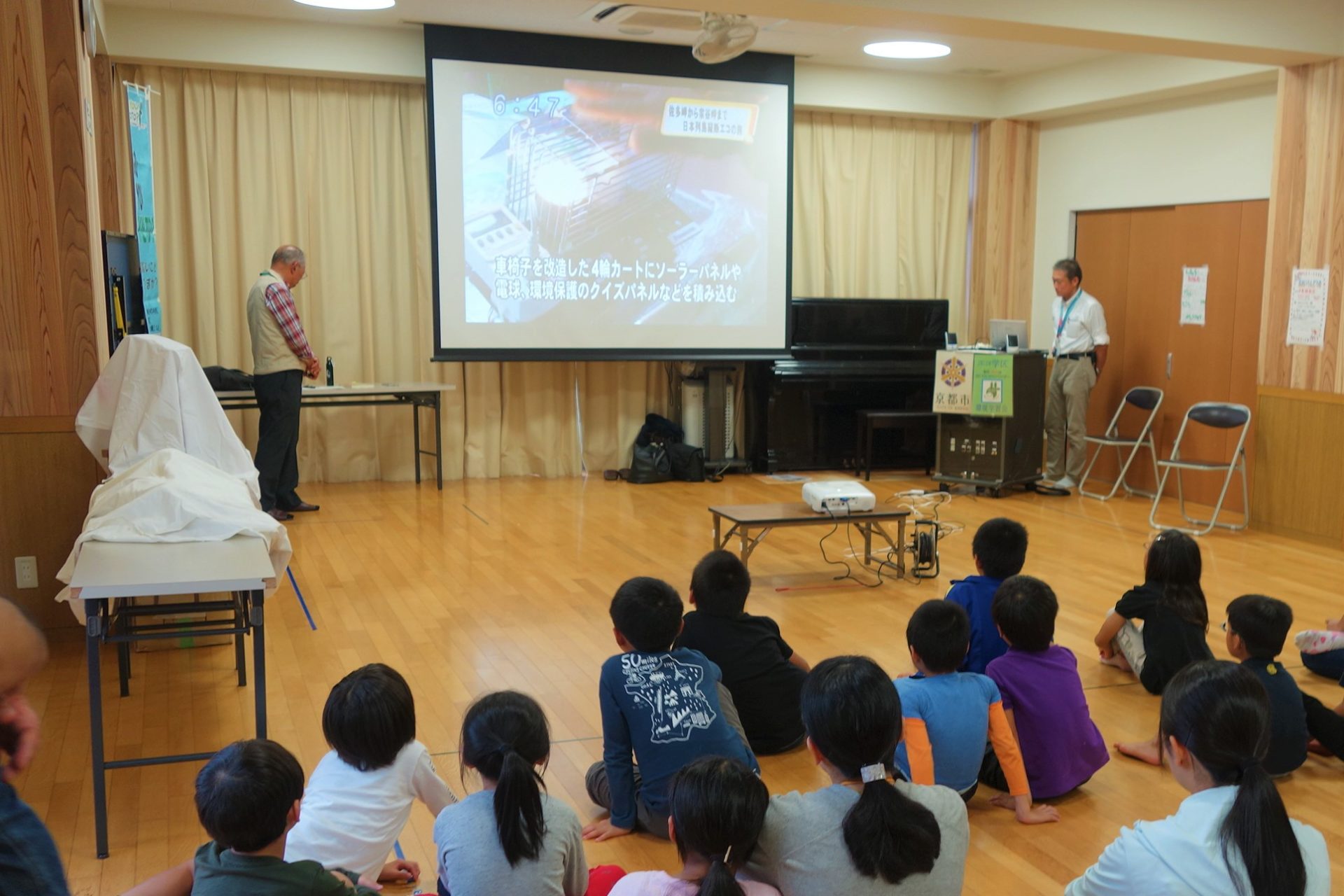 | 様子 | 参加者は講師が歩いて日本を縦断した話を興味を持って聞いていました。エコクイズにはみんなが大きな声で参加し,少し難しい質問にも答えていました。発電体験でも時間を忘れてしまうくらいに楽しんでいました。子ども達の感想で「発電の体験でおもちゃを動かして,勉強したことが頭に入ってきた。」とあり,実体験から学びを深めている様子でした。 |