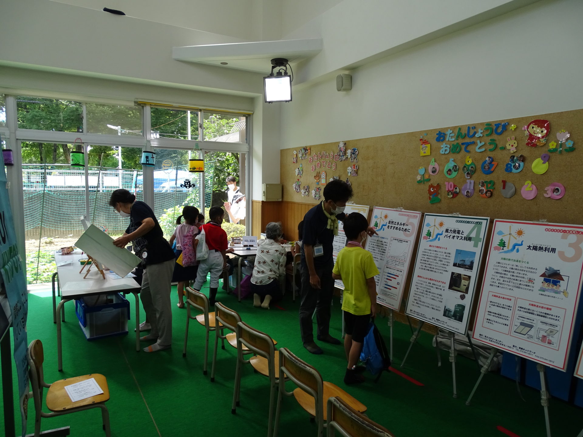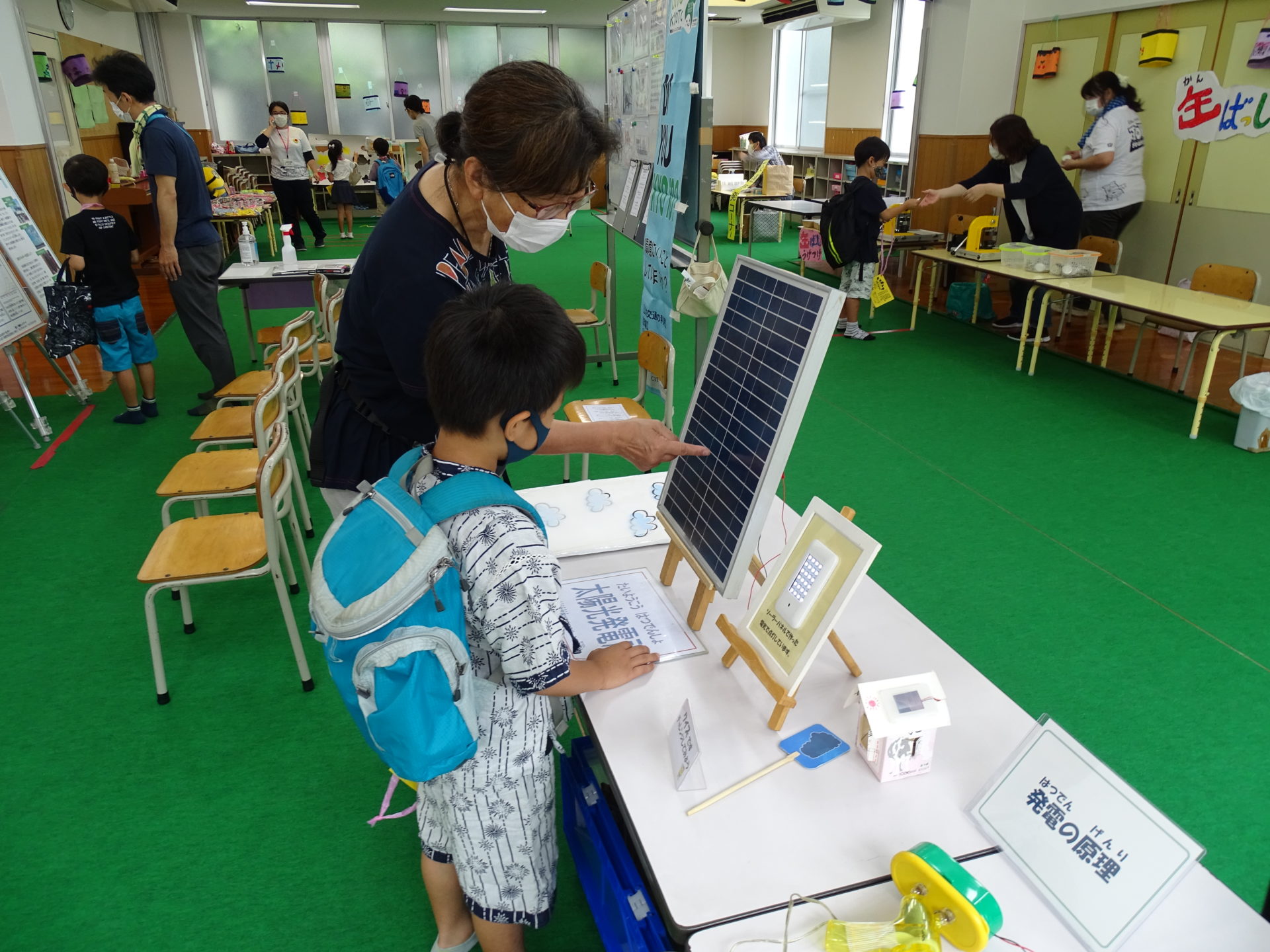 | 様子 | 児童館の夏まつりで,自然エネルギーについてブース出展を行いました。コロナウイルス感染拡大防止対策として,学年ごとに時間を分けての実施でした。 低学年の子どもたちに対し,クイズを交えて「CO2」についてわかりやすく説明し,パネル展示を見たり発電体験をすることで,太陽光・太陽熱・風力などの自然エネルギーについて楽しみながら学んでもらいました。多くの子ども達が,家電製品からCO2が出ていることを知らなかったが,家庭の省エネ冊子を用いて説明すると熱心に話を聞いてくれました。 |