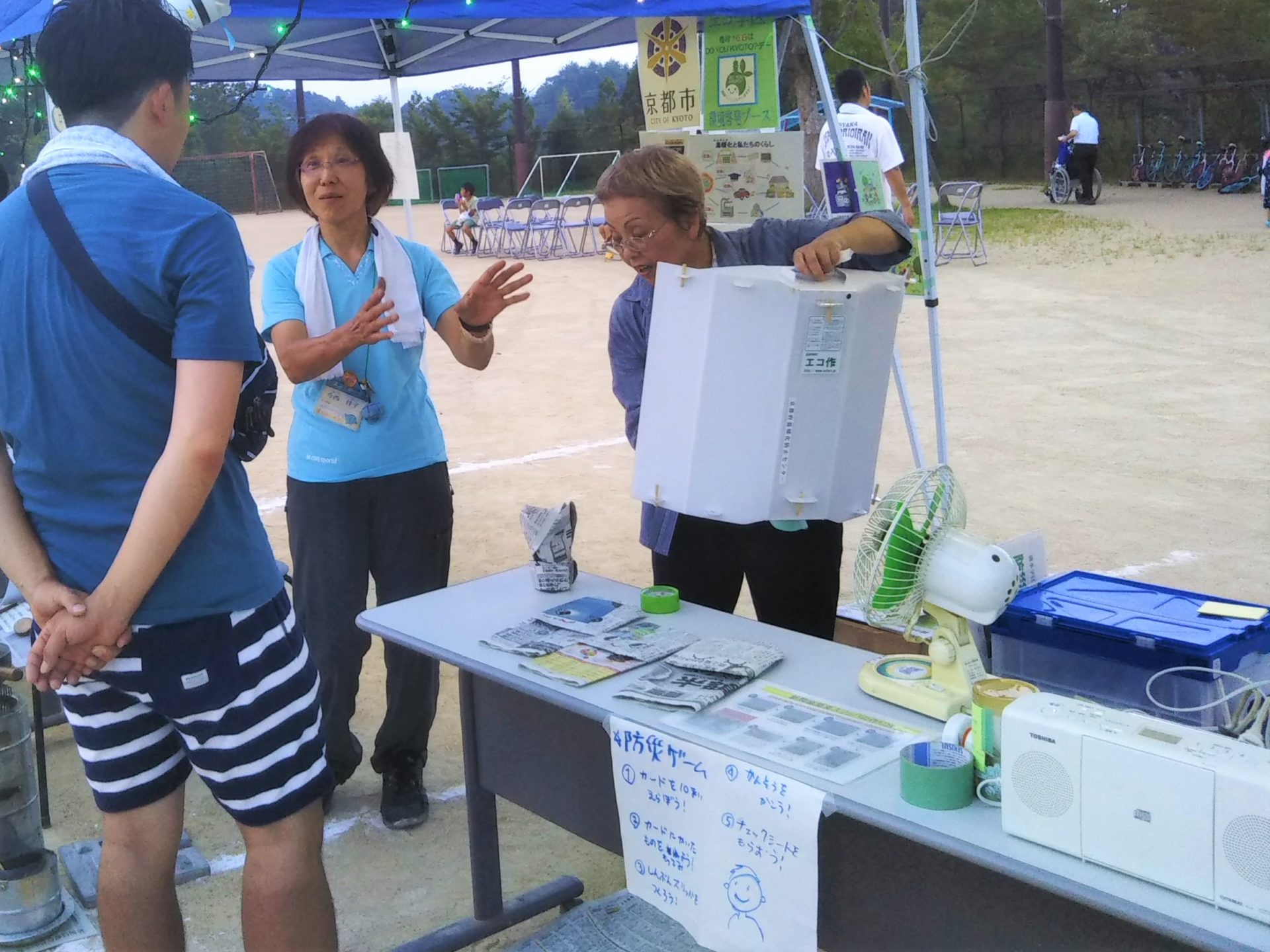 様子 展示物のロケットストーブやエコな防災グッズとソーラーパネル充電器セットの詳しい性能を質問されるなど,大人の参加者が大変関心を示していました。非常用持ち出し袋のゲームでは,4歳から70歳まで幅広い年齢層の参加があり,中学生は友達同士で真剣に入れるものを考えていました。