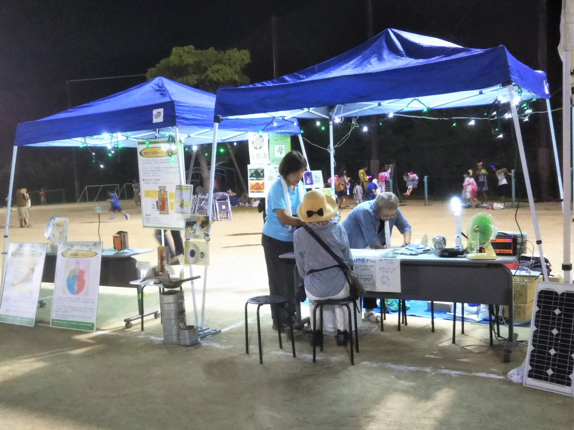 学区活動の報告では,京都環境賞の奨励賞受賞や昨年までの学区内のエコ活動をパネルで展示しました。また,普段からのエコな考え方や行動が災害時の対応にもつながることを伝えました。昨年の台風で3日間停電した方などは,「ソーラーパネル充電器セット」の購入を考えられていました。