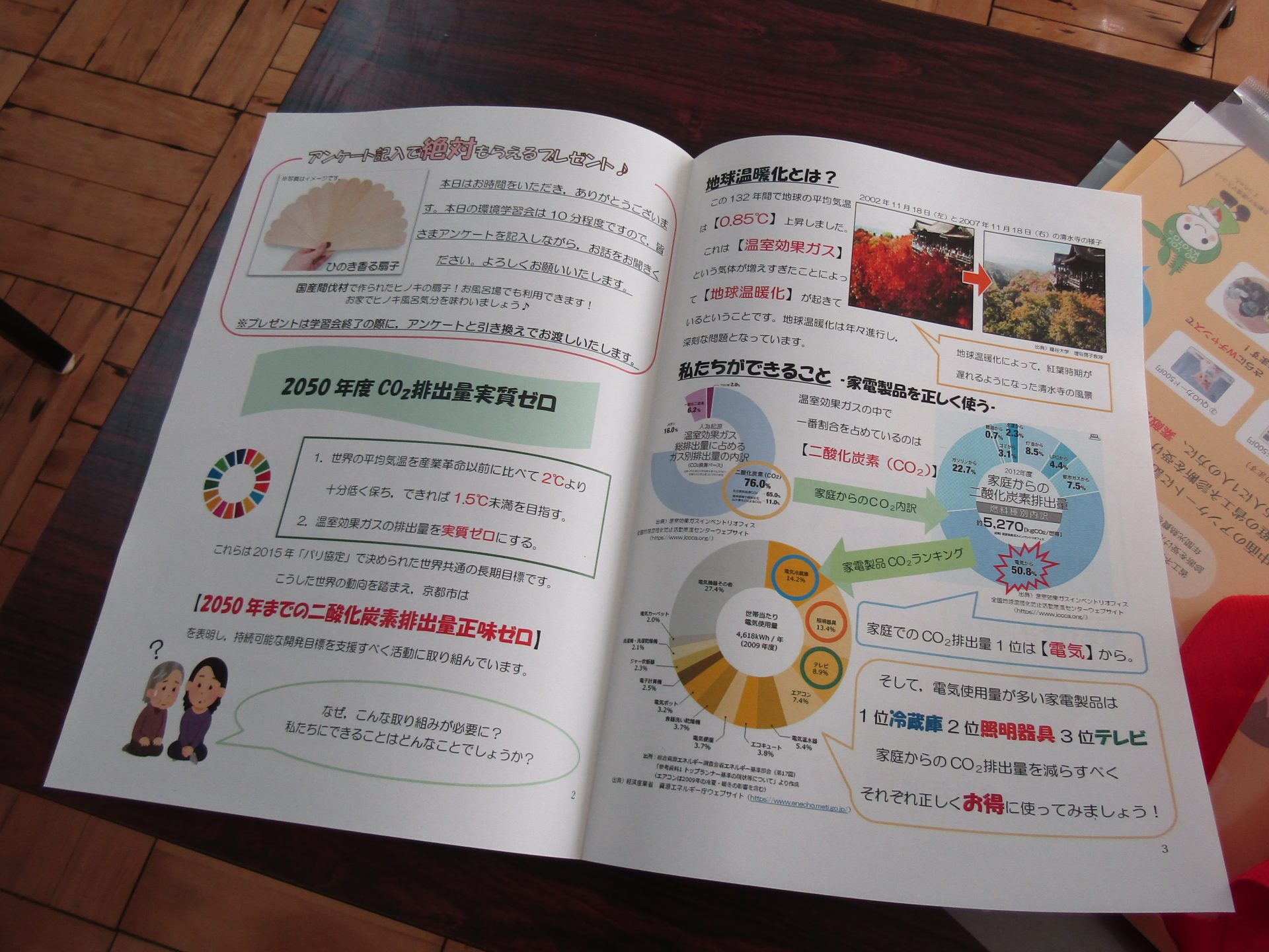 | 様子 | 深草学区自治連合会役員を対象に実施。コロナ対策のため短時間で行う必要があり,役員会の冒頭10分をいただいて,環境啓発資料の説明を行った。「学区全体で取り組まないといけない。」「10分では短い。」といったご意見をいただき,エコに強い関心を持っている方々がおられた。 |