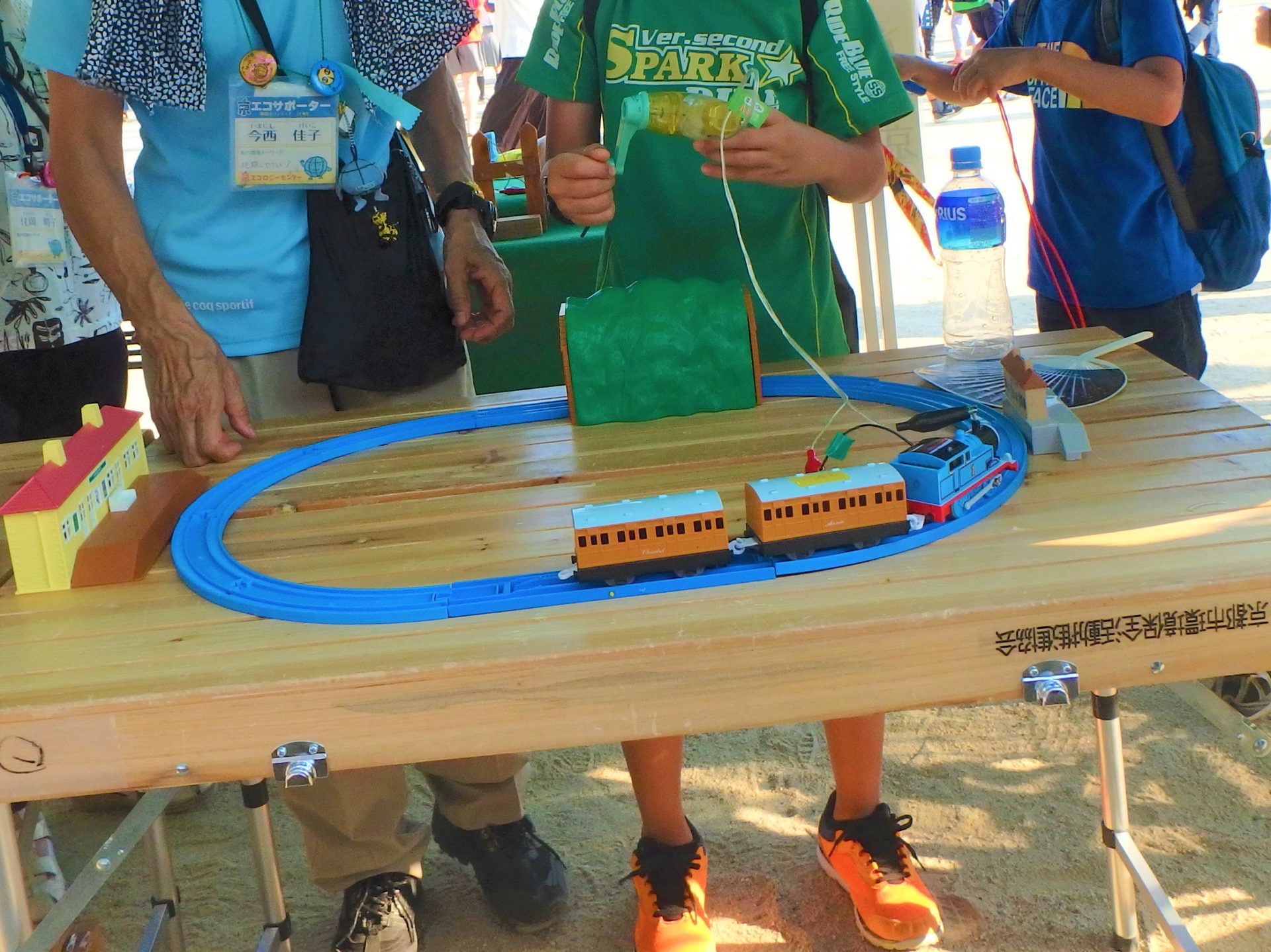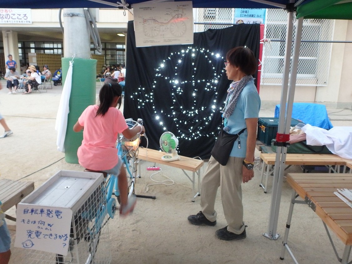 ブースに訪れてくれた方々は幼稚園児から中学生と幅広く,親子の参加も多かった。 発電の仕組みに興味を持ち,質問をする子どもたちや京エコロジーセンターの環境イベントに関心を持つ保護者もおられた。