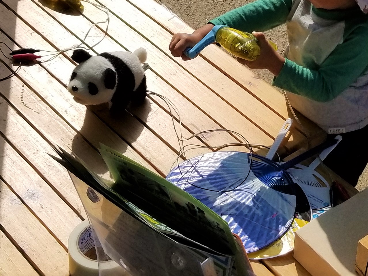 開会宣言を待たず,子どもがブースを訪れ,開会後はブースに訪れた子どもが友達を呼んでくれ,その友達が友達を呼ぶ形でたくさんの参加がありました。風力発電・手回し発電ともに人気で何度も体験しにくる子が絶えませんでした。 |
