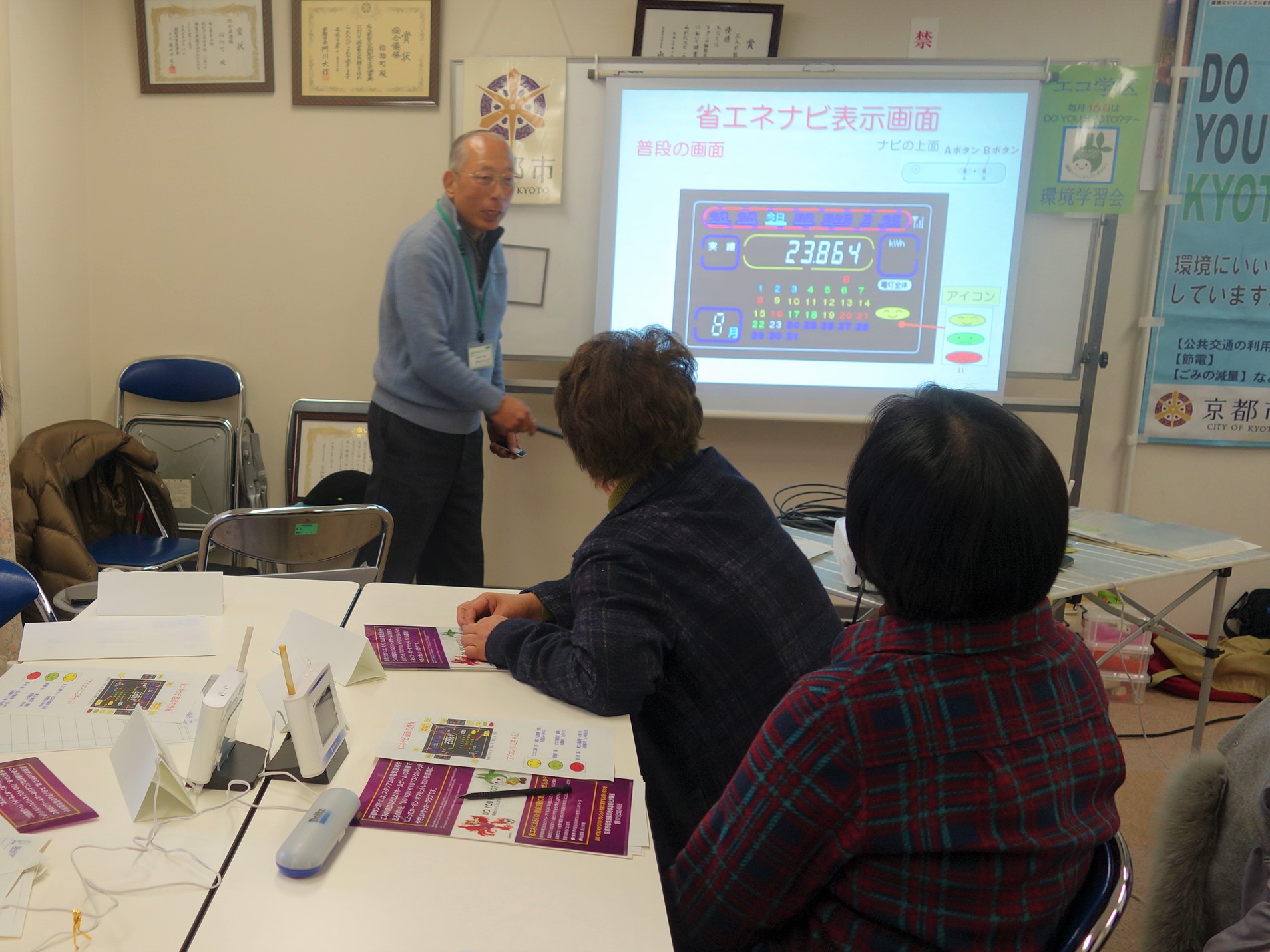 説明会時に記入してもらった自己紹介シートとエコライフ診断シートの結果を発表し,各家庭で取組が進んでいない項目を今後取り組めるように声かけをしました。最後に省エネナビの見方や使い方も簡単に説明しました。 |