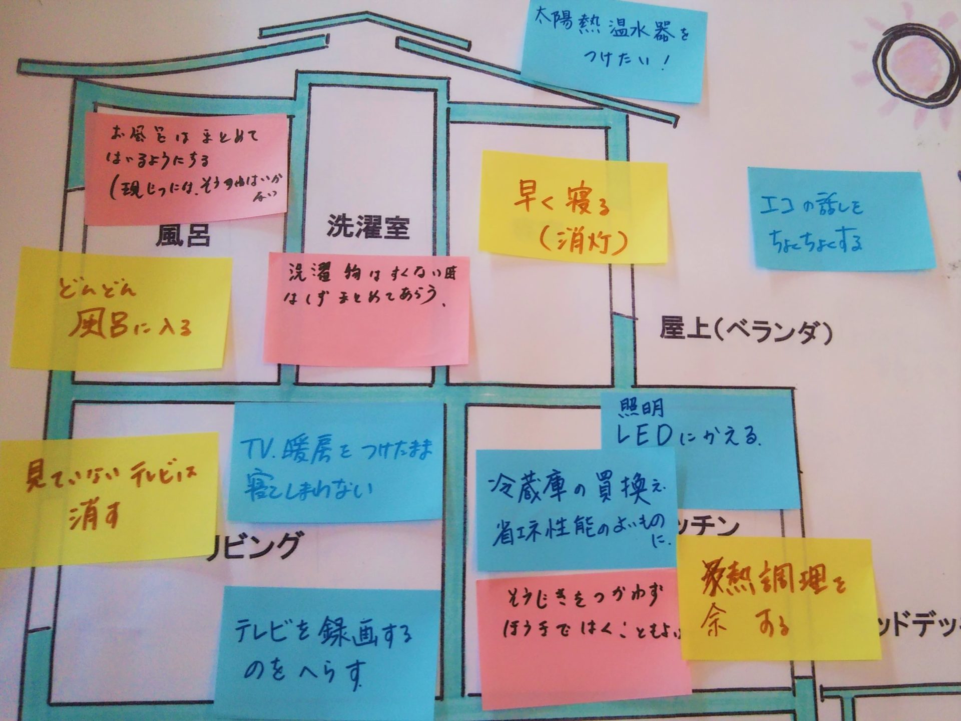 | 様子 | 今回の取組でひと世帯当たり8.5%の削減に成功したことを報告しました。はじめ省エネに関心が薄かった方も,会を重ねるごとに意欲的に取り組んでいました。また,この取組を地域のサークルやコミュニティに資料配布されたり,少しずつでも活動を広め続けていきたいとの声をいただきました。 |
