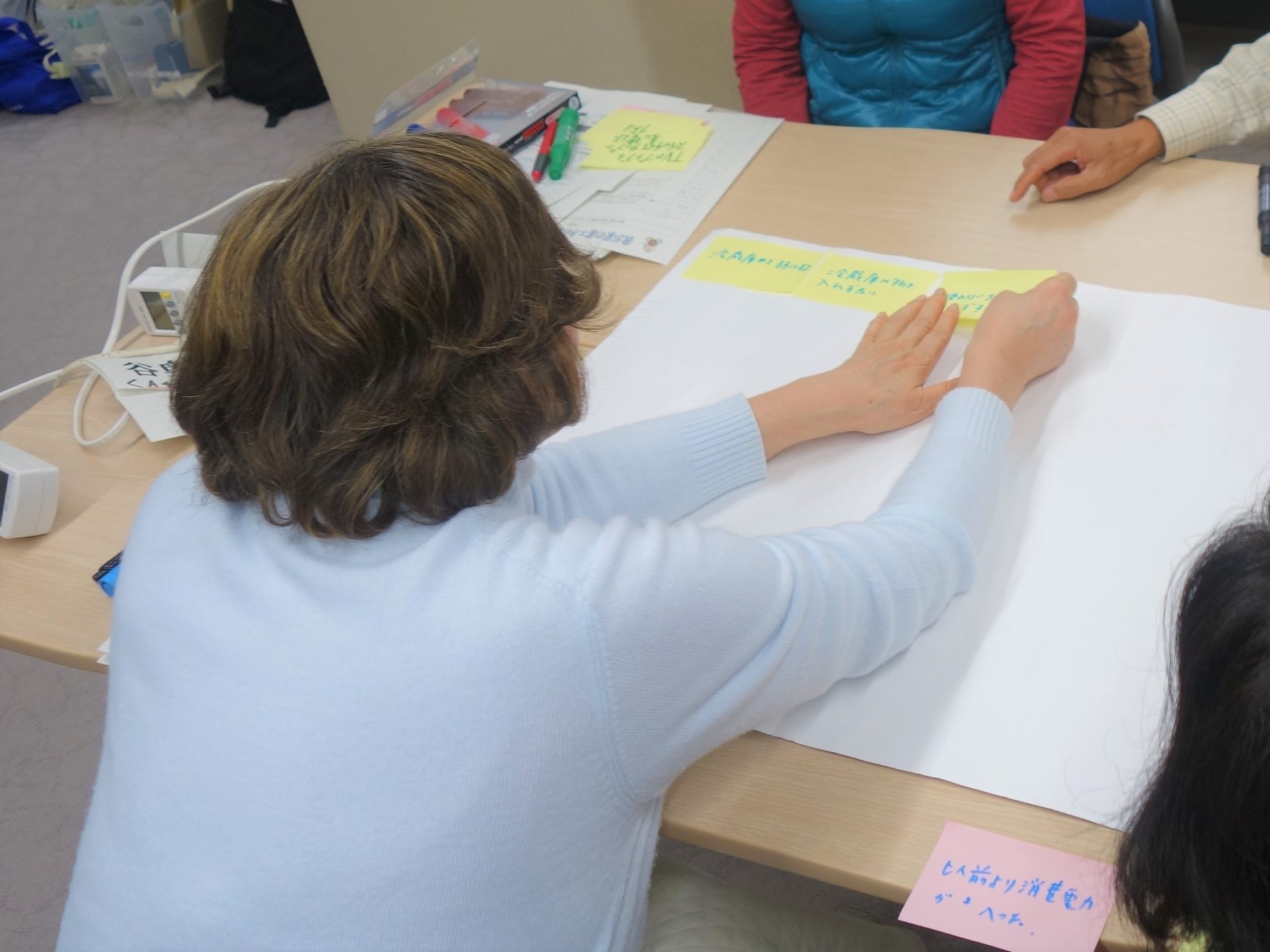 各家庭で省エネに取り組んだ様子を,グループに分かれて意見交換を行いました。「テレビを見ていないときは消すようになった。」「冷蔵庫の設定温度を変えた。」など,皆さんが積極的に取り組まれたアイディアの報告がありました。 |