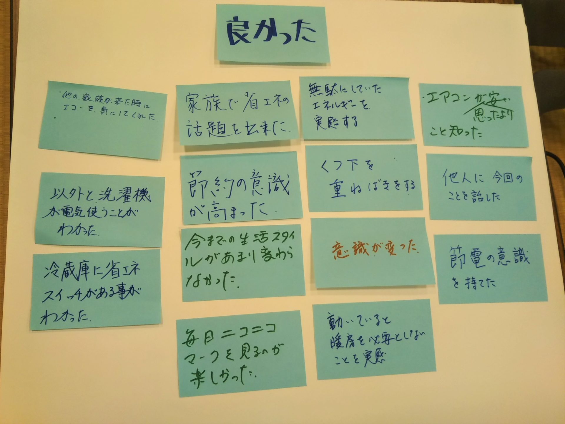 省エネ体験報告では「テレビを見ていない時は,消すようになった。」「冷蔵庫の設定温度を変えた。」など積極的に取組まれたアイディアを発表してもらいました。それぞれの家庭でのアイディアを活かして,新たな取組にもトライするようにお声かけをしました。 |