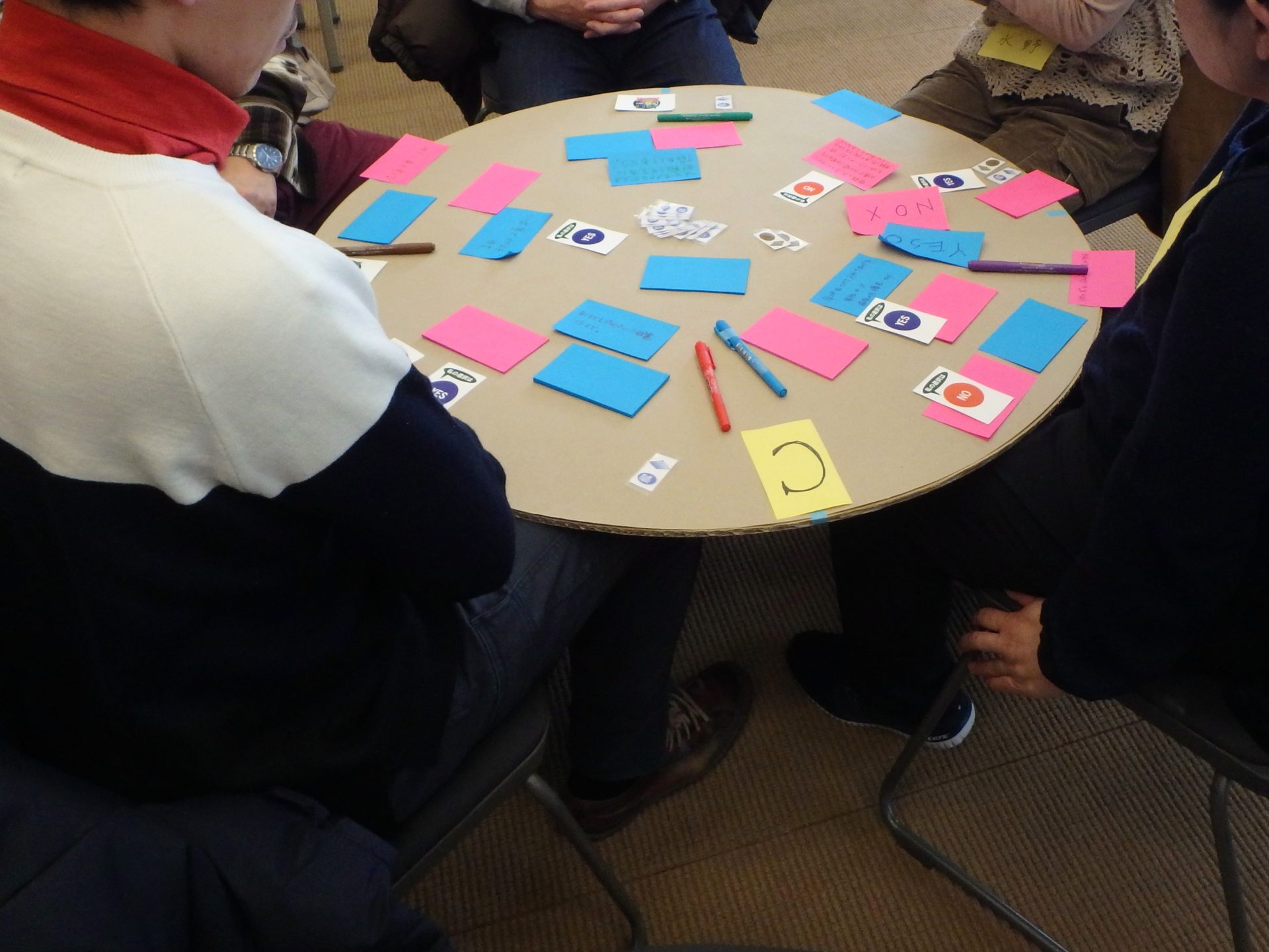 様子 4つのグループに分かれ,各グループで活発な意見交換をしていました。桂学区の防災訓練時にはペットの対応について検討されていると教えていただきました。参加された方からは「1つの事でも考え方が違い,みんなの意見が聞けてよかった。」と感想がありました。