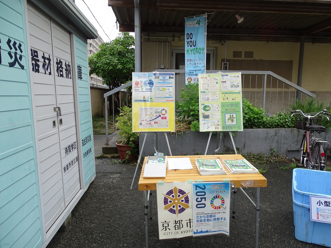 様子 今回はコロナ禍のため,移動式拠点回収(屋外)の機会を利用し,ブース出展を行いました。拠点回収自体も時間短縮され(1時間),前半に人が集中しました。地域の方々が,少しでもごみをリサイクルできるよう拠点回収を活用している様子が伝わってきました。CO2削減についても啓発できるよう,資料にアンケートを添付して配布したところ,学区民の方から「じっくり家で読みたい。」と興味を示していただきました。