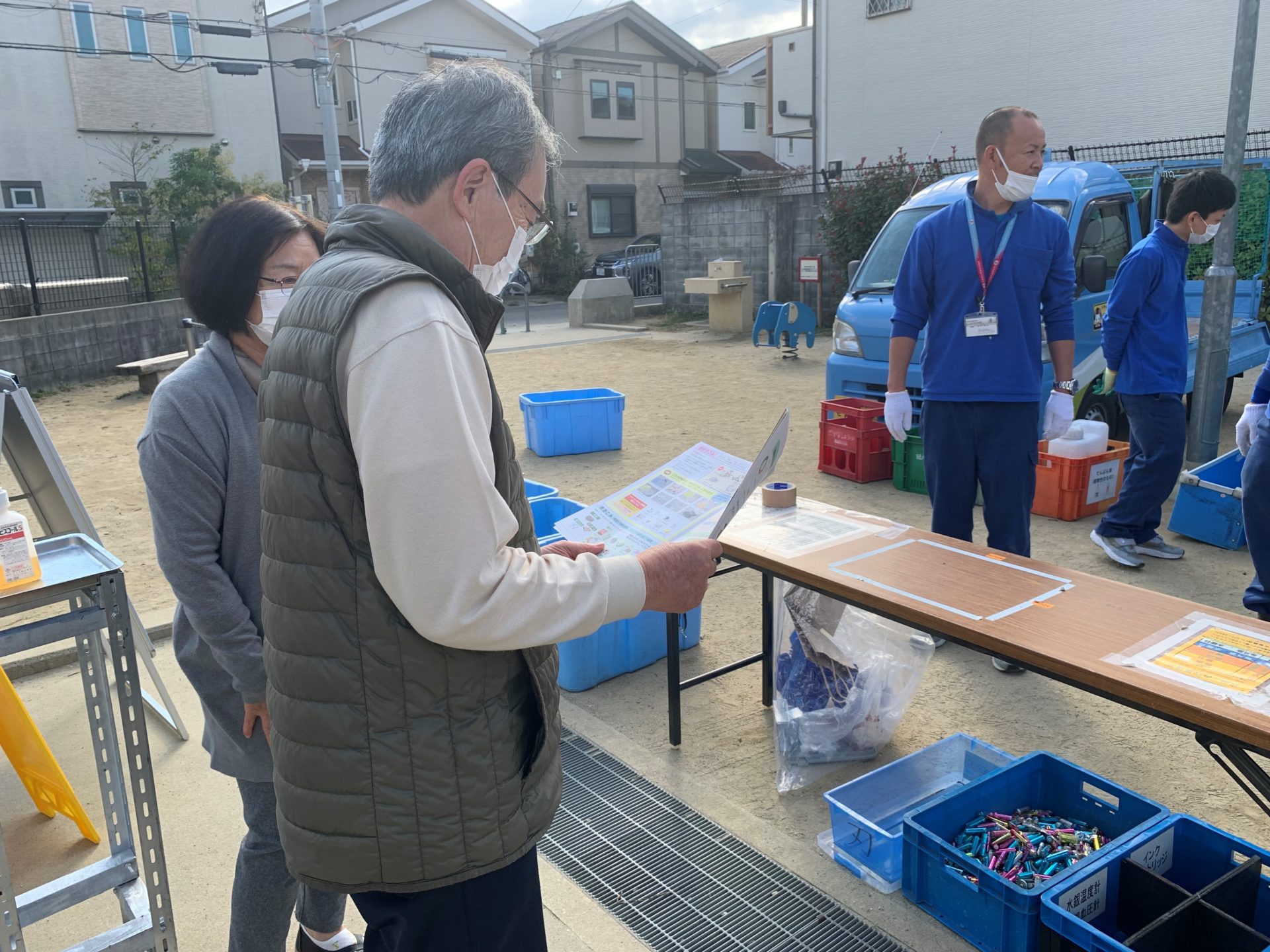| 様子 | 2ヶ所で行われた資源物拠点式回収にて,環境啓発冊子を配布したところ,すぐに読んでくださる方や,ごみの分別方法について質問される方もおられました。MIRAIの展示には特に男性が興味を持っておられ,説明を聞いていただきました。 |