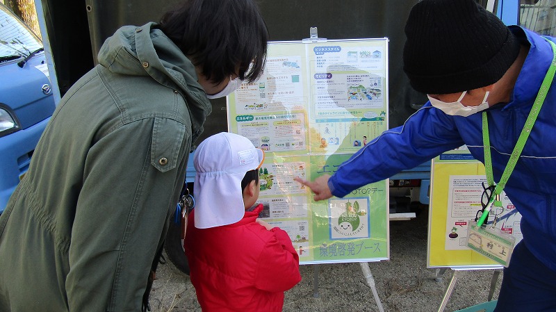 様子 移動式資源物回収の場で温暖化防止の啓発活動を行いました。啓発冊子をお渡しし説明すると,しっかり話を聞いてくださり「さっそく帰って読んでみます」とお話がありました。  また,ごみの分別方法や出し方を聞きに来る方もたくさんおられ,エコまちステーションの職員が丁寧に回答していました。