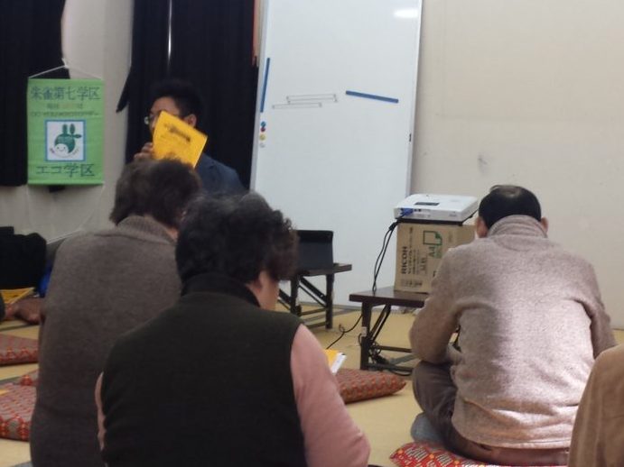 自分たちの学区のエコ取組の確認と地球温暖化の最新の影響を交えながらエコ学区が提供できる支援を説明 ...