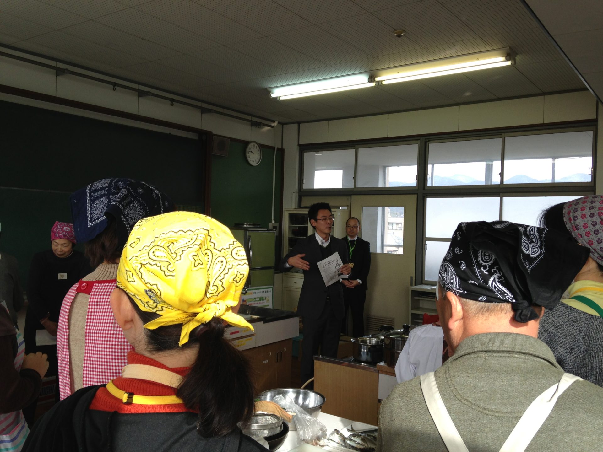 様子 手開きであじといわしを下ろし,長芋の蒸し物・かしわの南蛮風・茶殻のふりかけを作りました。食卓を囲みながら【震災時に調理器具が揃わなくても料理ができる】【旬の食べ物】【簡単にできる生ごみ堆肥】の話と地球温暖化についての話を交え,中身の濃い学習会となりました。
