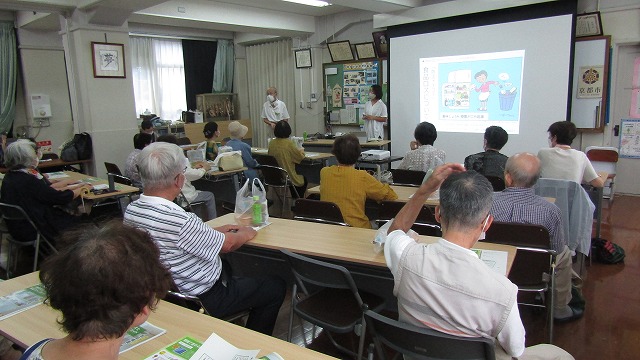 今回は26名の方にお集まりいただき、エコ学区サポートセンタースタッフが「地球温暖化と食品ロス」についてお話させていただきました。