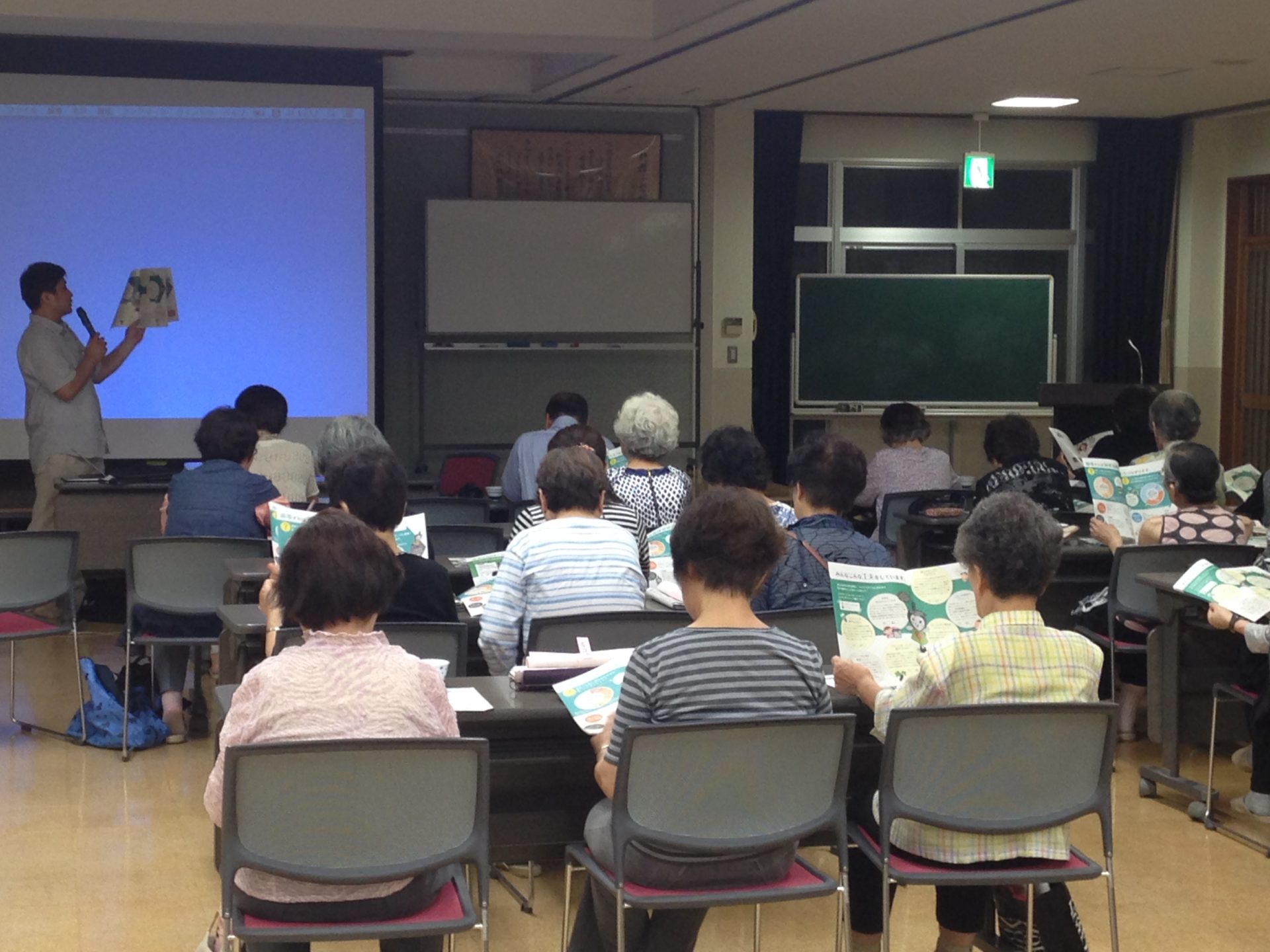 | 様子 | 30分程度の学習会で,温暖化の現状をデング熱や広島市安佐南区の大雨・土砂災害を例に挙げて説明し,環境家計簿の冊子を配って各家庭で実際に取組めることを紹介しました。質疑応答では打ち水の効果や家の中,特に,窓辺の対策が効果的であることなどを補足説明するなど,暮らしの中での省エネに対する関心の高まりがうかがえました。 |