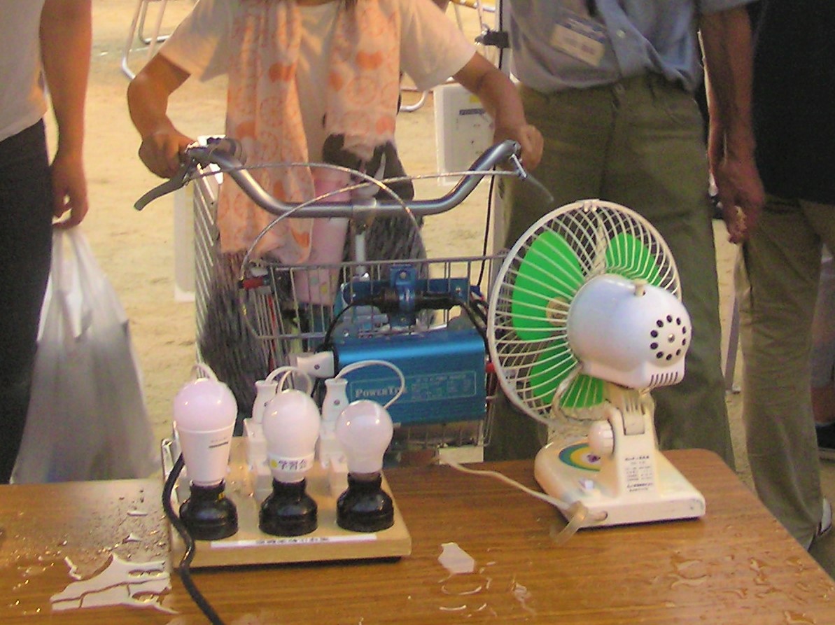 開始時間に雨になり,参加人数が少ない中ではあったが,自転車発電や手回し発電で,電気の大切を伝えることができました。