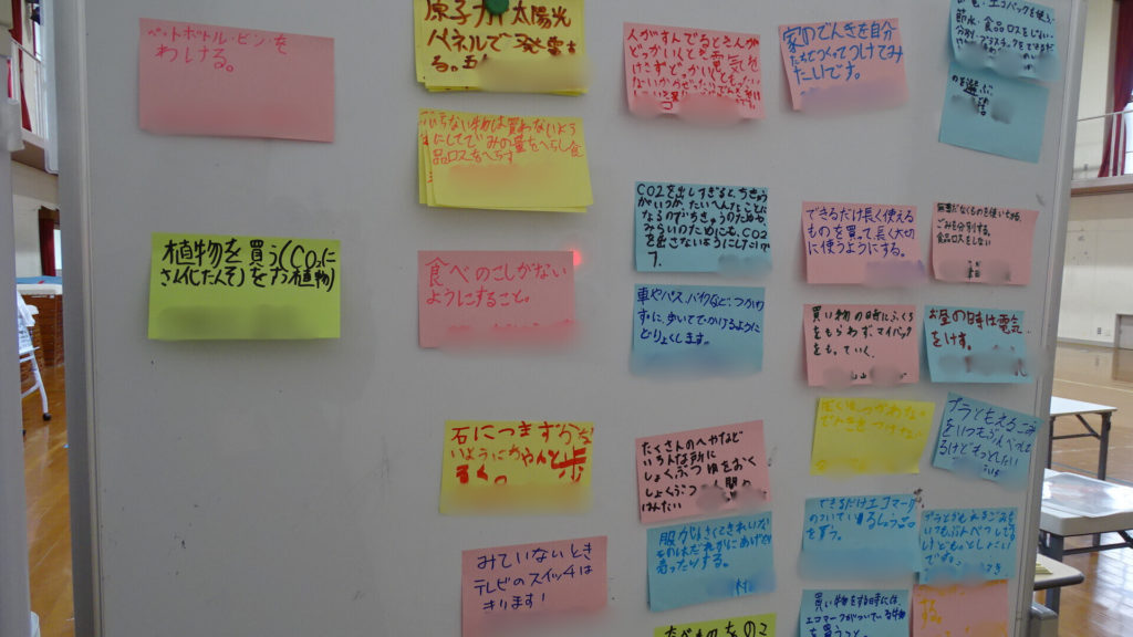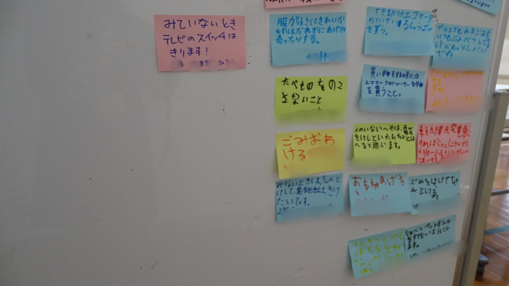 地球温暖化の説明や自分達がどんなことをしなければいけないかを伝えると、悩みながらもみんな頑張ってアイディアを書いてくれていました。