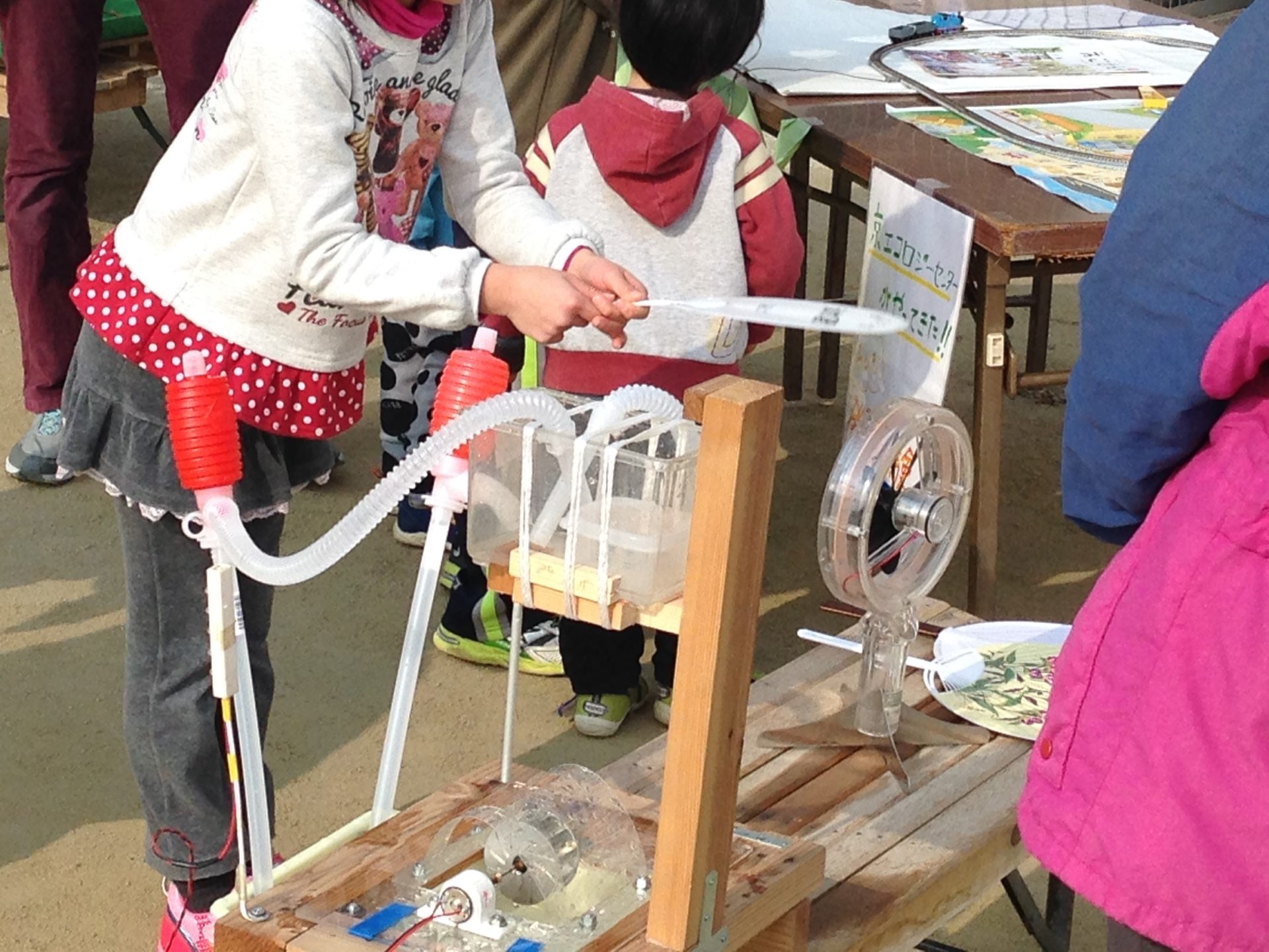 | 様子 | 前半は曇り空だったが後半からはよく晴れてソーラーカーも走るようになり,風力・水力・太陽光・手回し発電など順番に体験してもらえました。 会場にはたくさんの方が来場しており,アットホームな雰囲気でした。途中で京エコロジーセンターのキャラクター「ちきゅまる」が登場し,子ども達は喜んでいました。 |