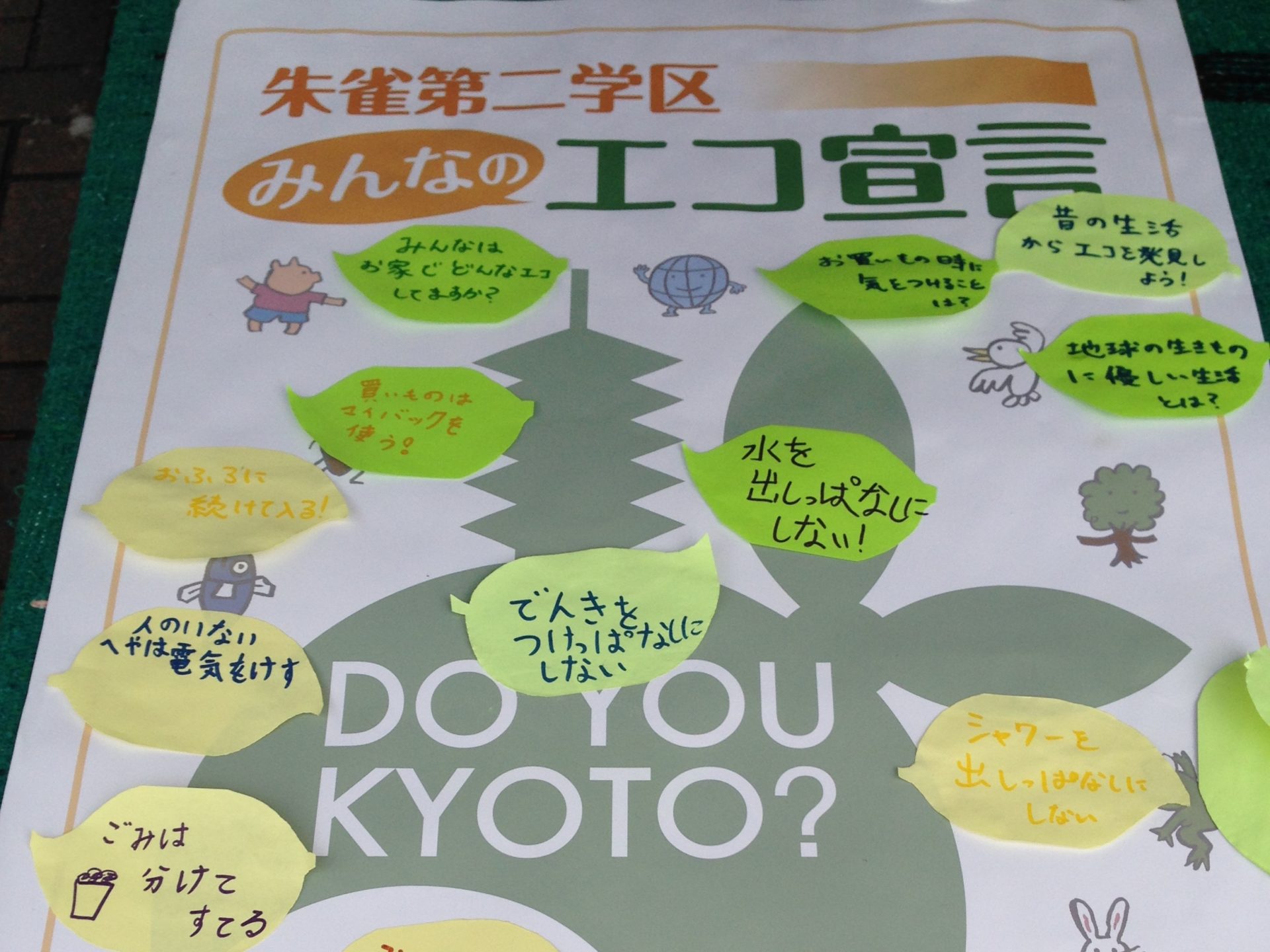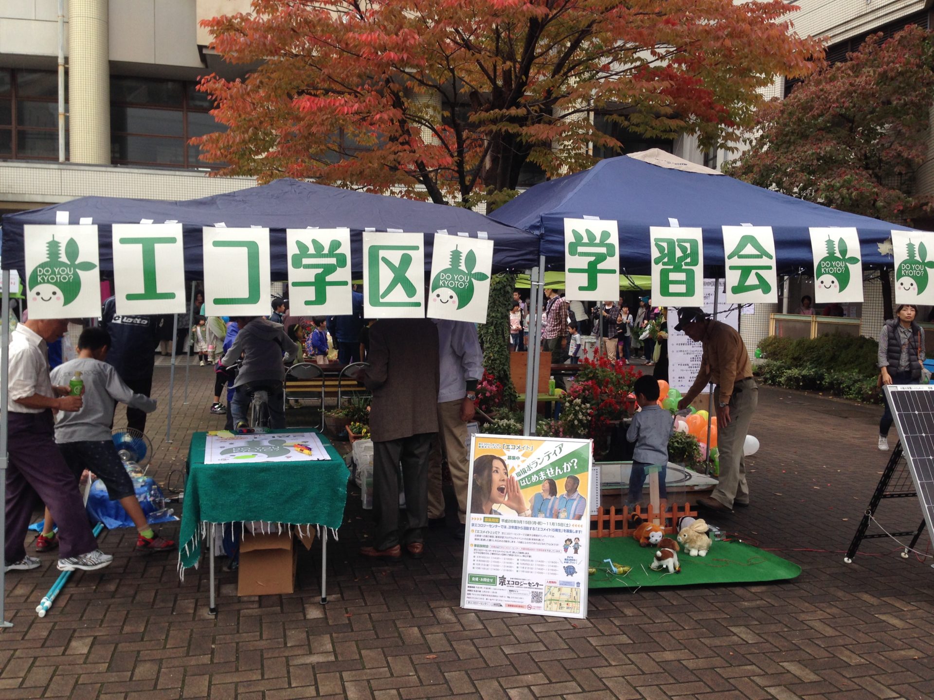 | 様子 | 雨模様のため来場者も少なめだったが,雨が上がるとにぎわいを取り戻しました。 ブースにはシャボン玉を飛ばす装置も設置でき,子ども達だけでなく大人の方にもも楽しく体験してもらいました。京エコロジーセンターのキャラクター「ちきゅまる」も登場し子ども達は大喜びでした。「みんなのエコ宣言」を子どもたちから募集でき,一人ひとりがしっかり考えてくれていました。 |