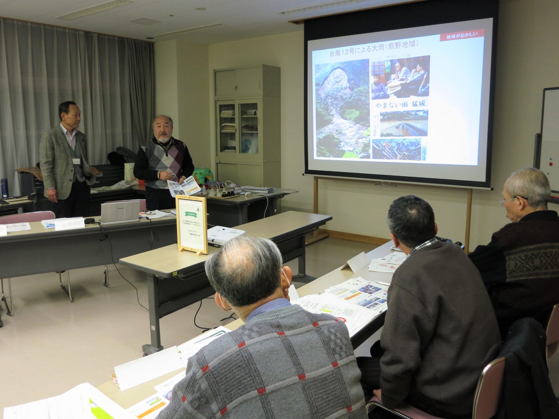 | 様子 | 説明会での自己紹介の際に記入した用紙のまとめを発表しました。「人柄がよい。」「みんな仲良し。」「コミュニティが良い。」といった地域のよいところが多く挙げられ,参加者の方々が地域へ愛着を持ち日常的につながりがある様子がうかがえました。その後家庭でできる省エネ術の紹介では,終始質問や意見が出てきて大盛り上がりとなりました。 |