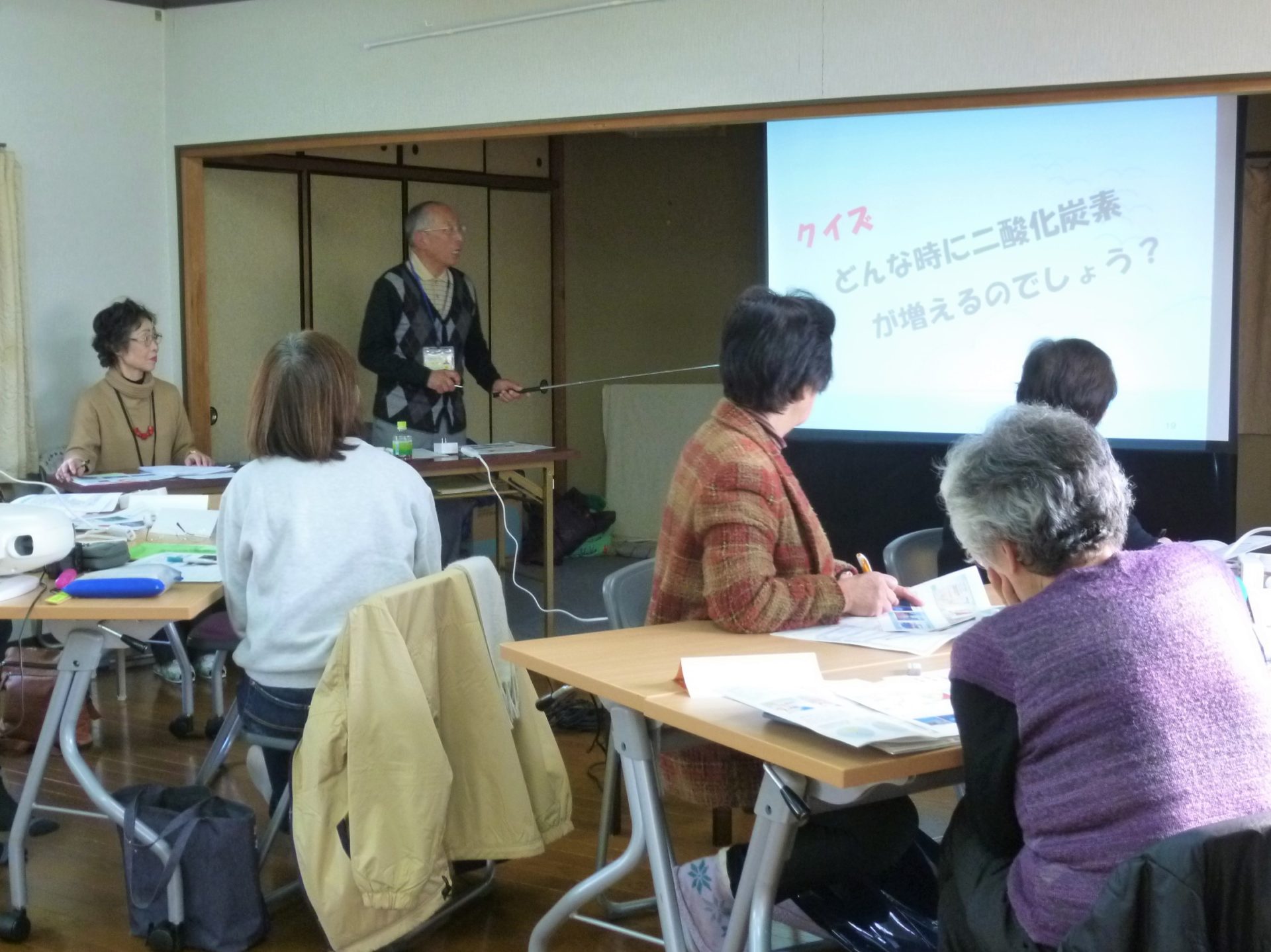 様子 省エネナビを使用した省エネ生活の取組を参加者の方々に聞いてみた。「冷蔵庫を弱にした。」「電気ストーブの使用を2本から1本に減らした。」などの回答があった。また「主人の後を追いかけて電気を消して回った。」と回答があった直後に「主人が電気を消して回った。」と答える方もおり,笑いのある会となった。